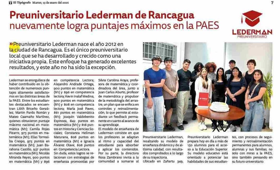 Título: Preuniversitario Lederman de Rancagua nuevamente logra puntajes máximos en la PAES