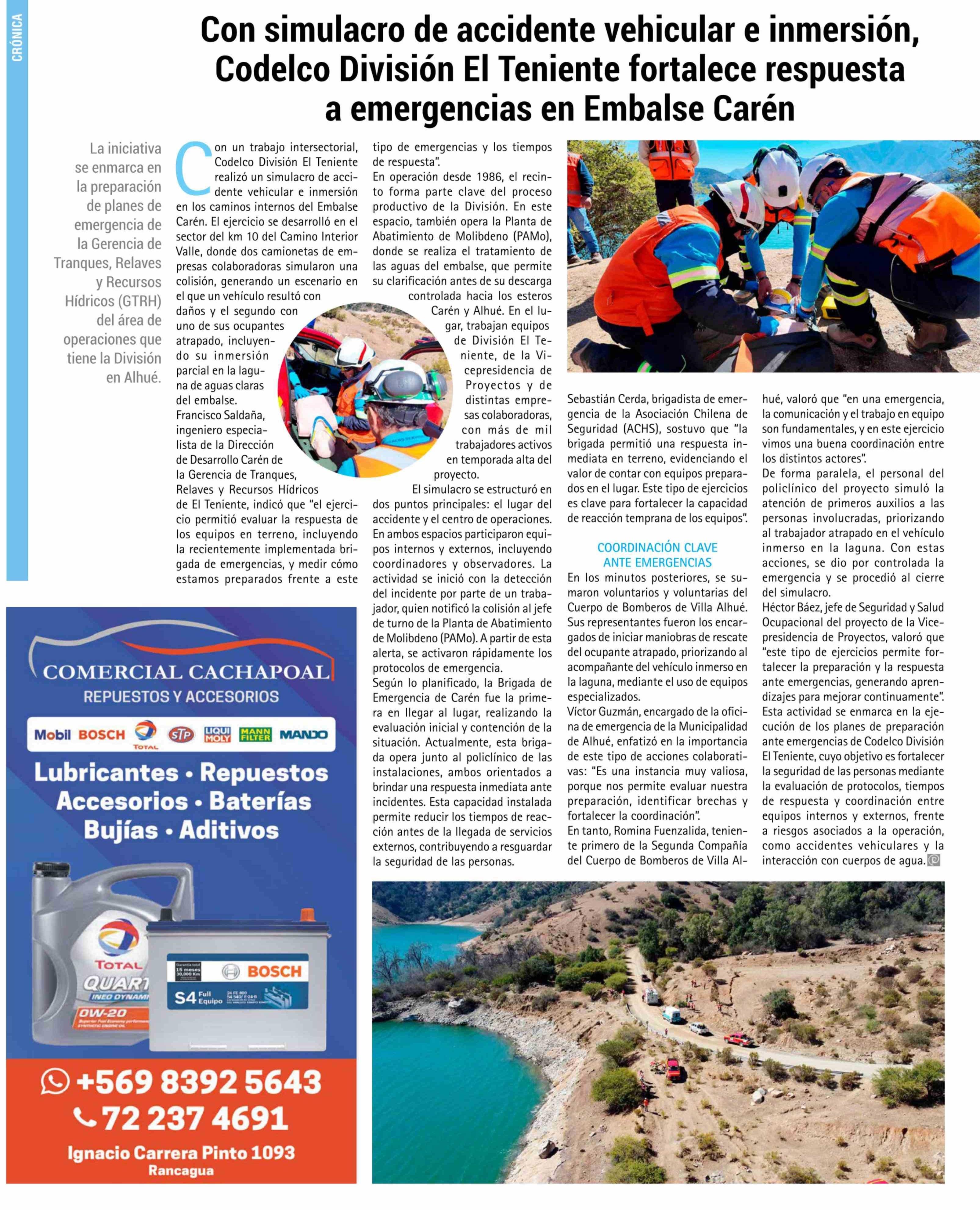 Con simulacro de accidente vehicular e inmersión, Codelco División El Teniente fortalece respuesta a emergencias en Embalse Caren 02-04-2026 El Rancagüino |