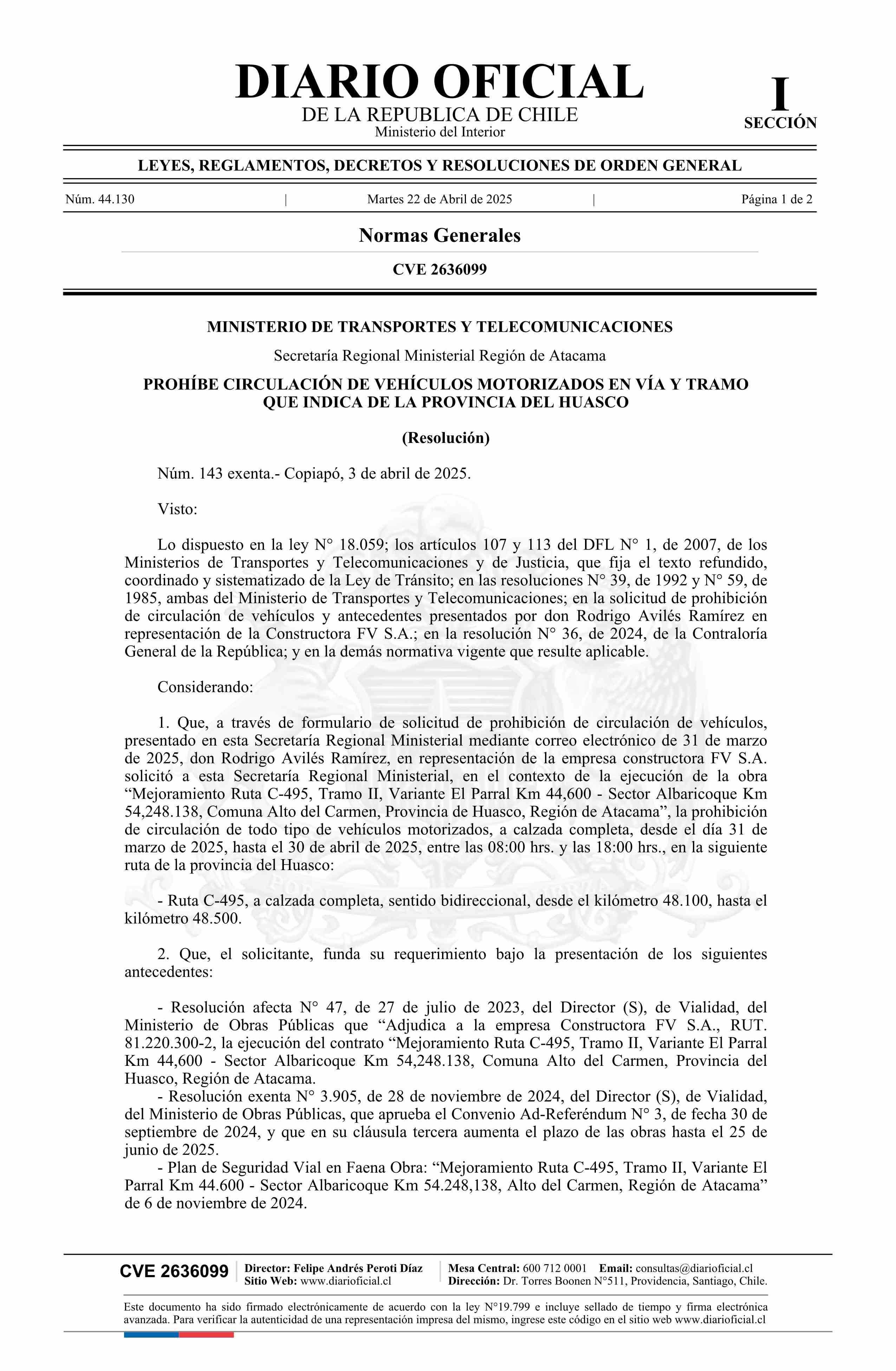 Resolución exenta número 143, de 2025.- Prohíbe circulación de vehículos motorizados en vía y tramo que indica de la provincia del Huasco 22-04-2025 Diario Oficial Edición Electrónica |