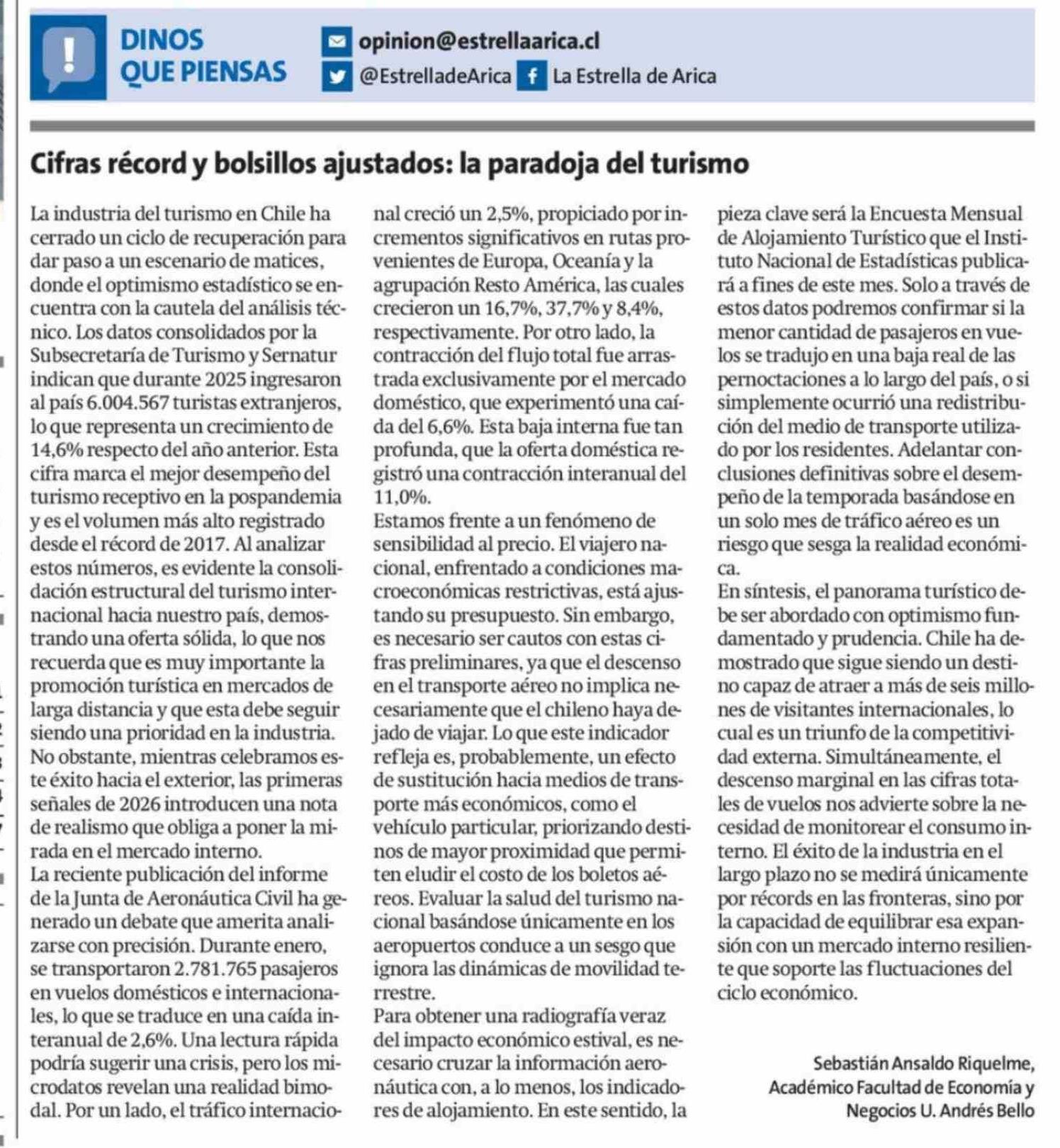 Cartas: Cifras récord y bolsillos ajustados: la paradoja del turismo 01-03-2026 La Estrella de Arica |