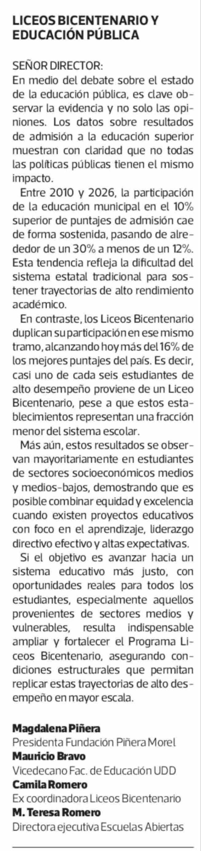 CARTA LICEOS BICENTENARIO Y EDUCACIÓN PÚBLICA 17-01-2026 La Tercera |