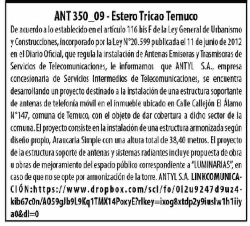 Título: Extractos: ANT 350_09 - Estero Tricao Temuco De acuerdo a lo establecido en el artículo 116 bis F de la Ley General de Urbanismo y Construcciones, incorporado por la Ley Nº20.599 publicada el 11 de junio de 2012 en el Diario Oficial, que regula la instalación de Antenas Emisoras y Trasmisoras de Ser
