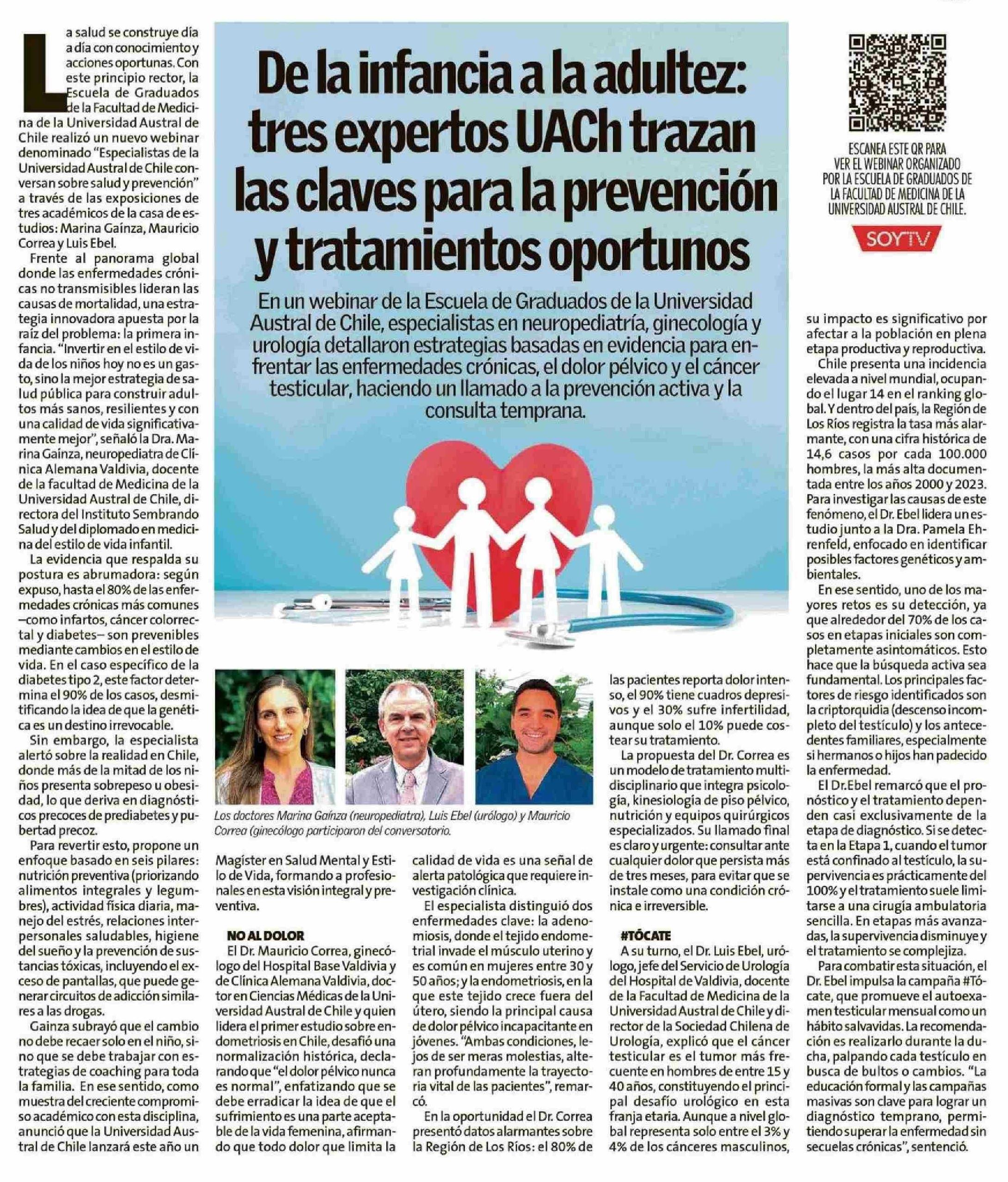 De la infancia a la adultez: tres expertos UACh trazan las claves para la prevención y tratamientos oportunos 27-01-2026 Diario Austral Región de Los Ríos |