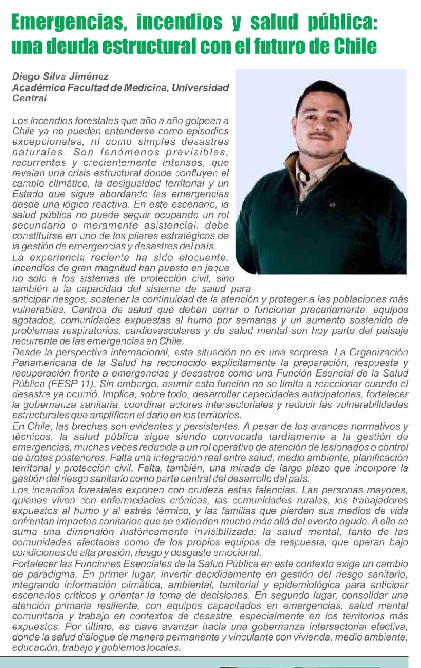 Título: Columnas de Opinión: Emergencias, incendios y salud pública: una deuda estructural con el futuro de Chile