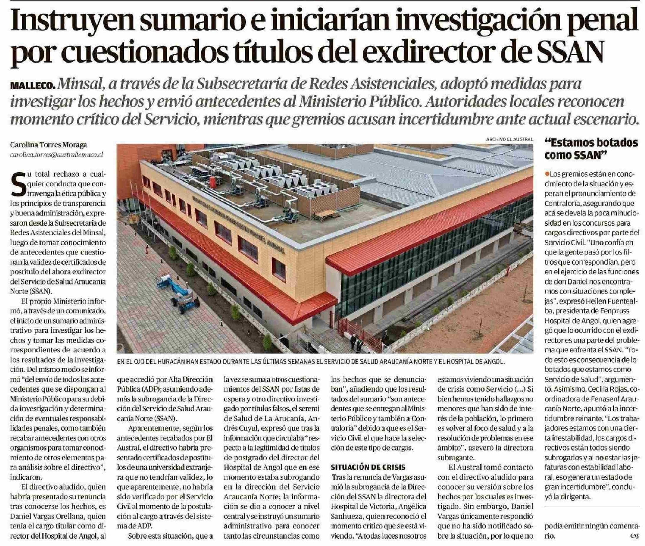 Instruyen sumario e iniciarían investigación penal por cuestionados títulos del exdirector de SSAN 29-04-2025 El Austral de la Araucanía |