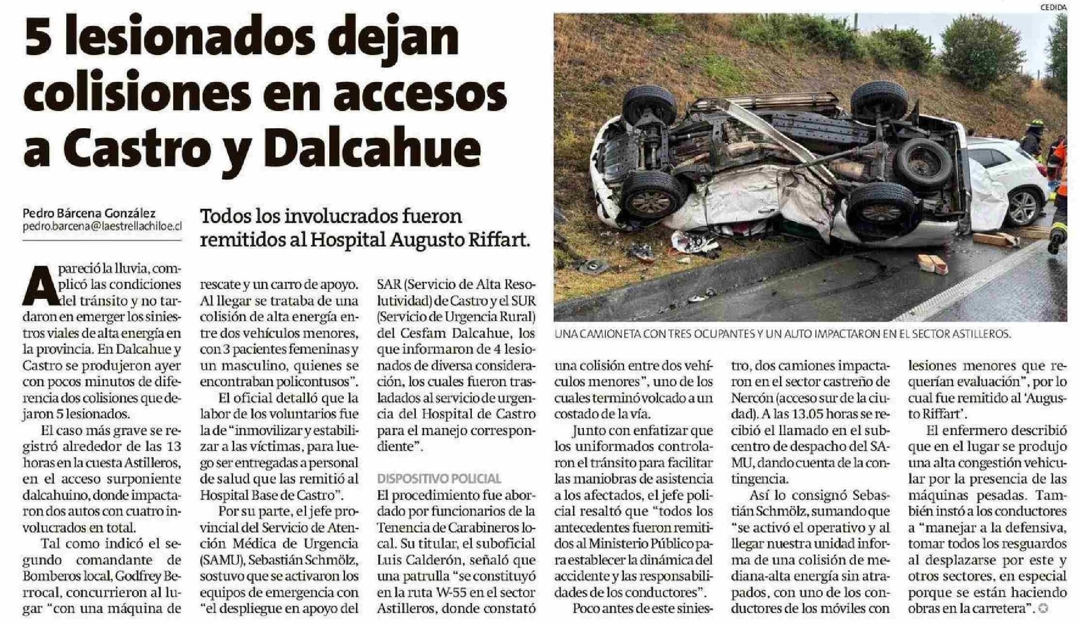 5 lesionados dejan colisiones en accesos a Castro y Dalcahue 15-01-2026 La Estrella de Chiloé |