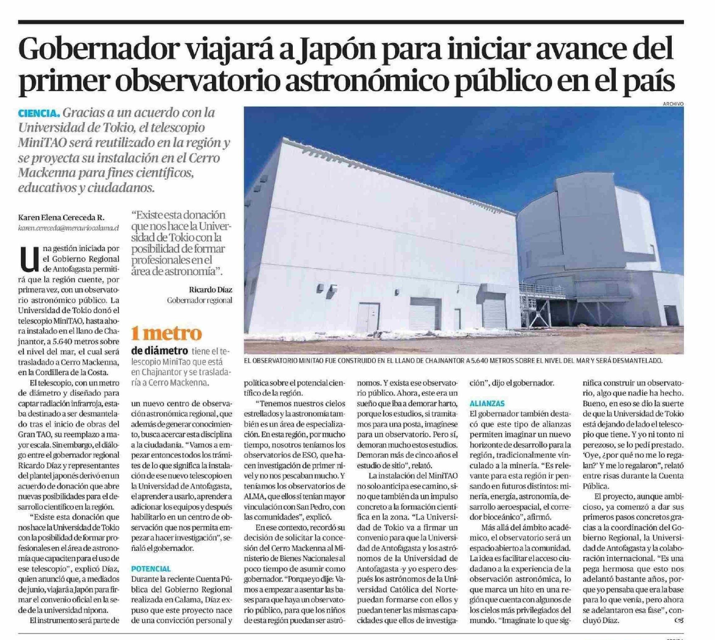Gobernador viajará a Japón para iniciar avance del primer observatorio astronómico público en el país 03-06-2025 El Mercurio de Antofagasta |