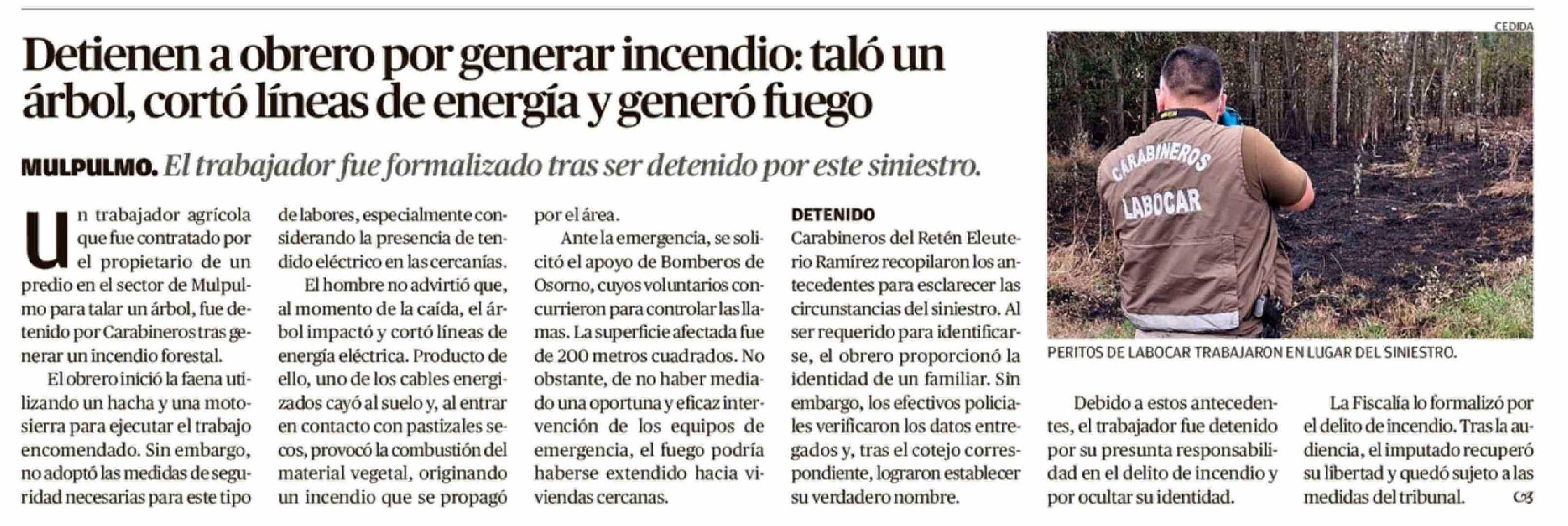 Título: Detienen a obrero por generar incendio: taló un árbol, cortó líneas de energía y generó fuego