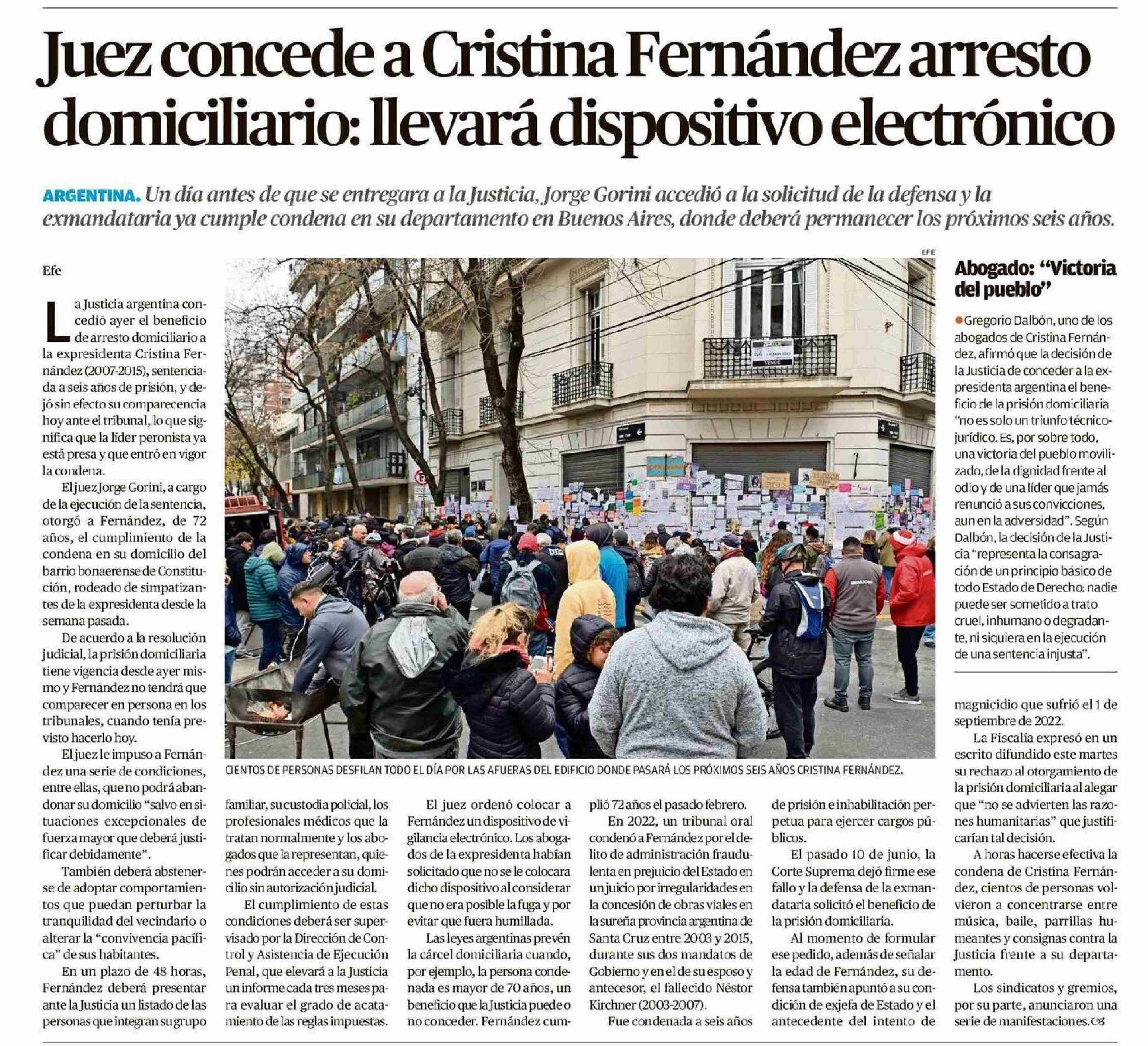 Juez concede a Cristina Fernández arresto domiciliario: llevará dispositivo electrónico 18-06-2025 Diario Austral Región de Los Ríos |