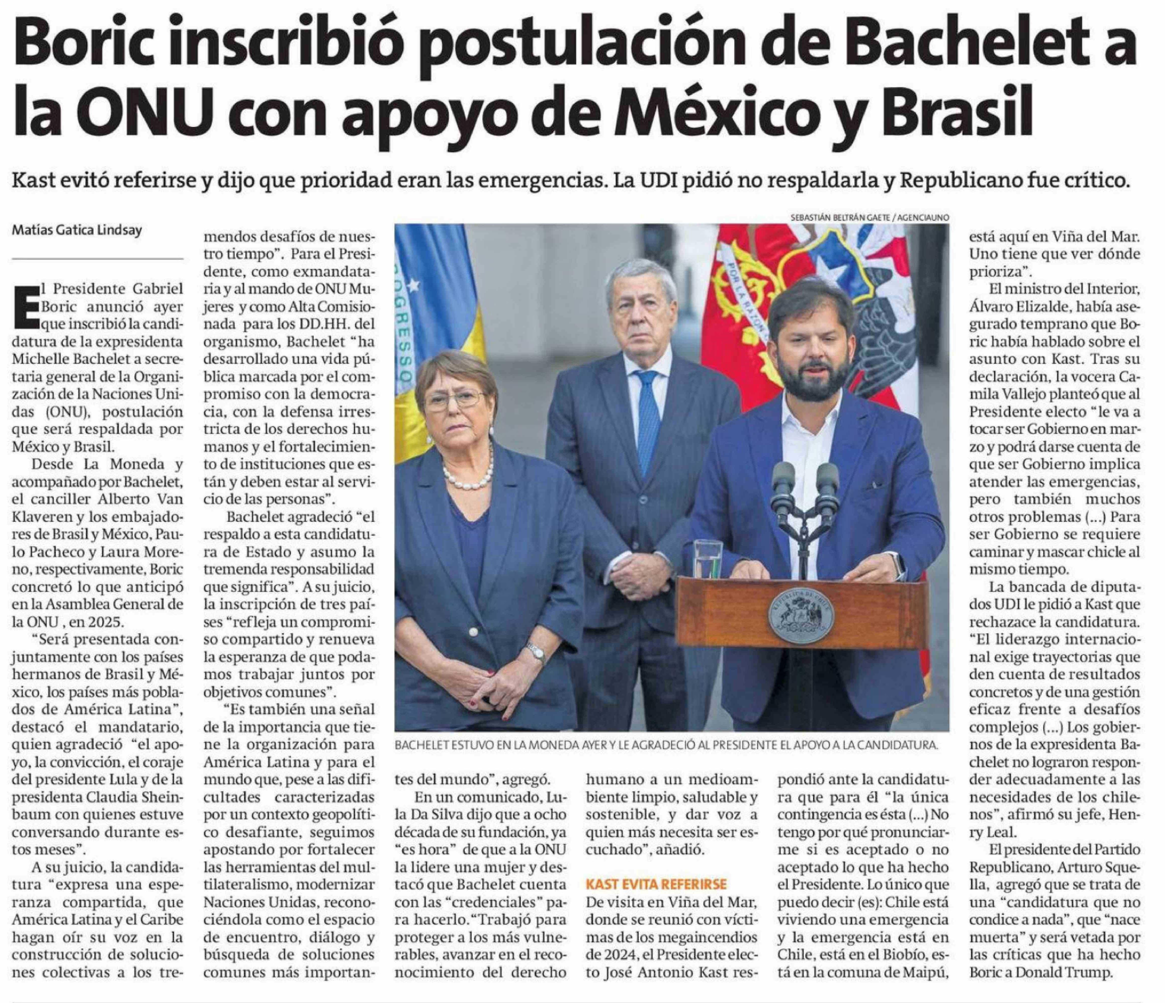 Título: Boric inscribió postulación de Bachelet a la ONU con apoyo de México y Brasil
