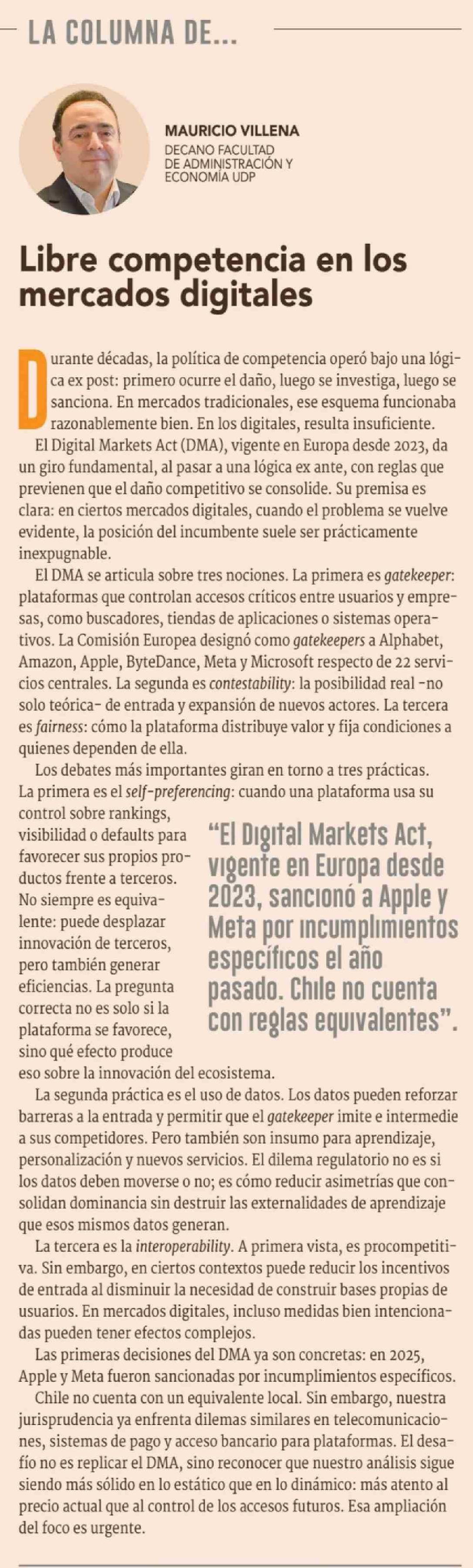 Columnas de Opinión: Libre competencia en los mercados digitales 09-04-2026 Diario Financiero |