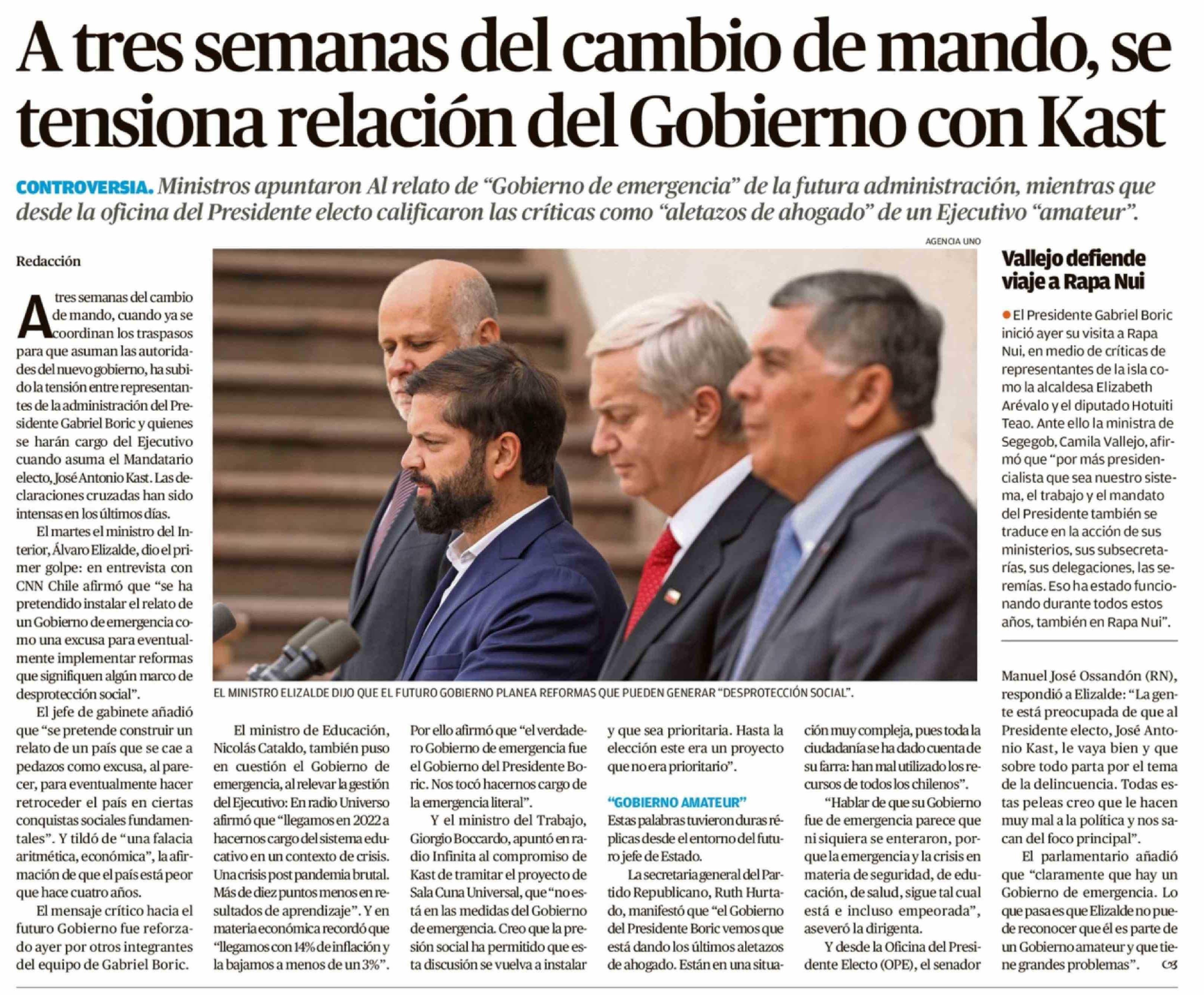 | Título: | A tres semanas del cambio de mando, se tensiona relación del Gobierno con Kast |