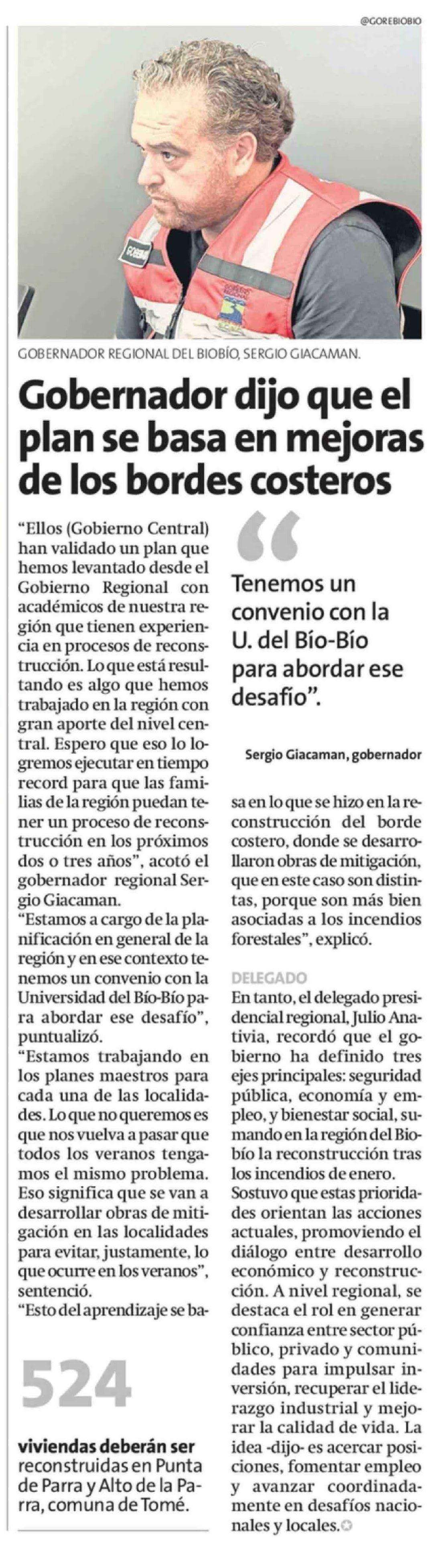 Gobernador dijo que el plan se basa en mejoras de los bordes costeros 28-03-2026 La Estrella de Concepción |