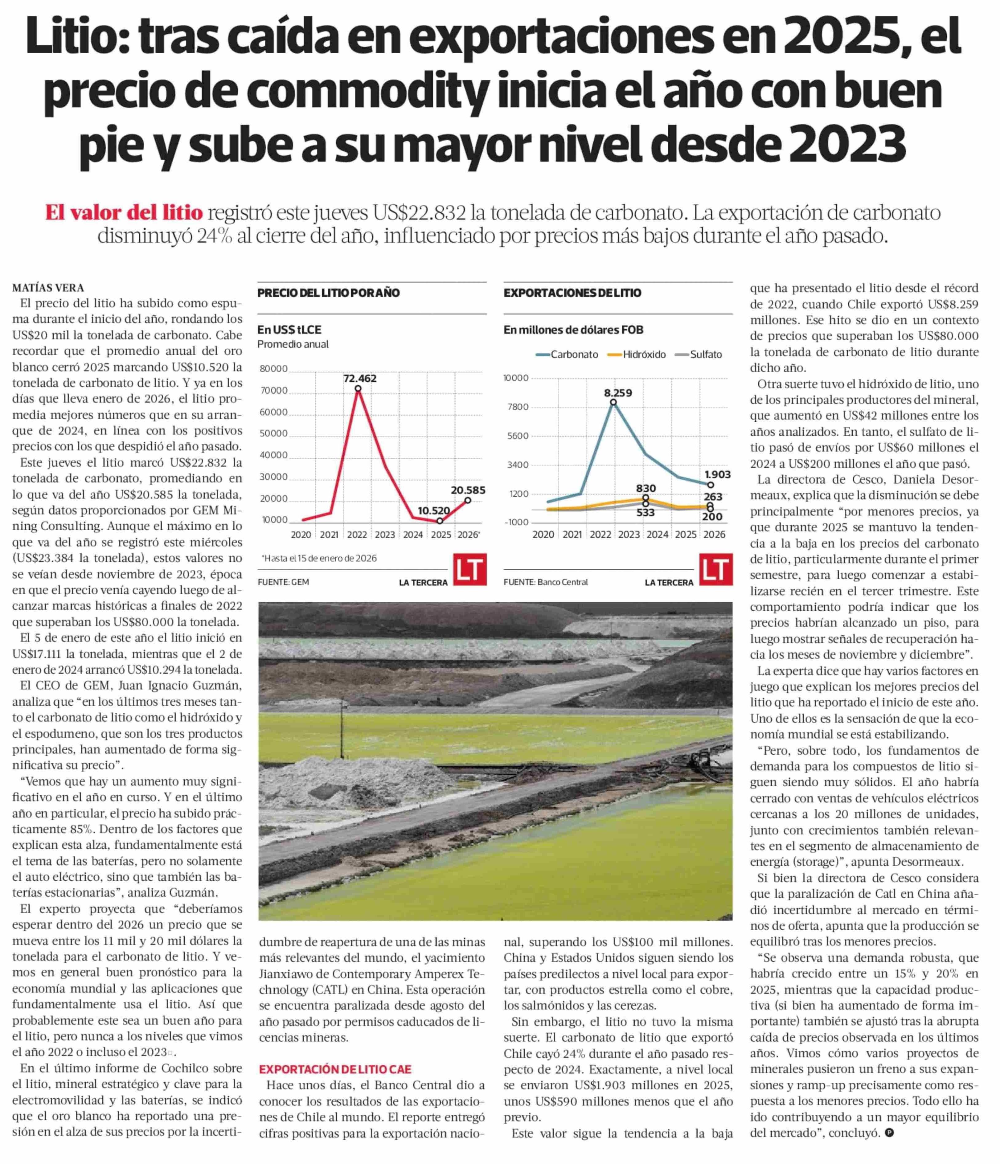 Título: Litio: tras caída en exportaciones en 2025, el precio de commodity inicia el año con buen pie y sube a su mayor nivel desde 2023