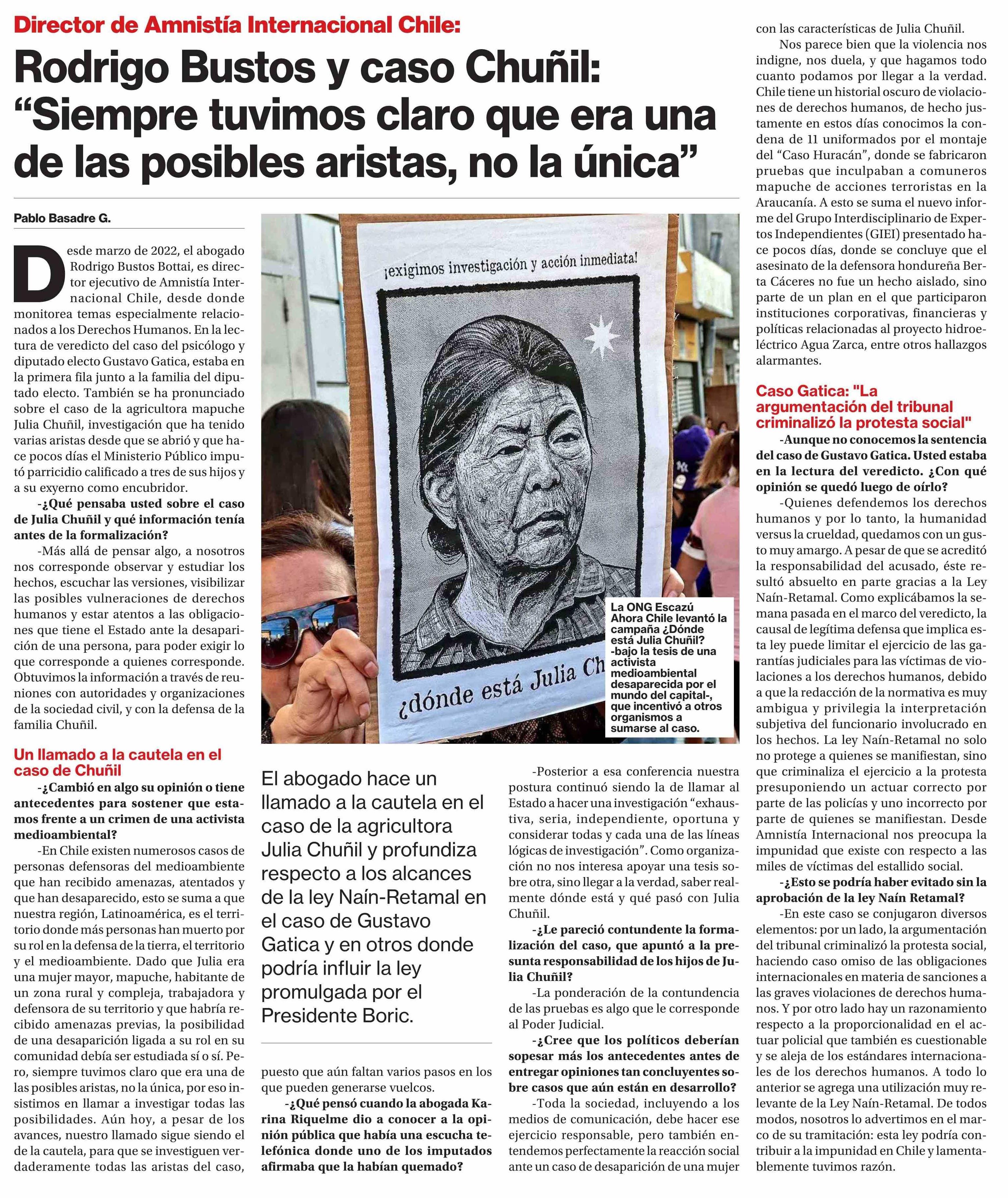 | Título: | Rodrigo Bustos y caso Chunil: "Siempre tuvimos claro que era una de las posibles aristas, no la única" |