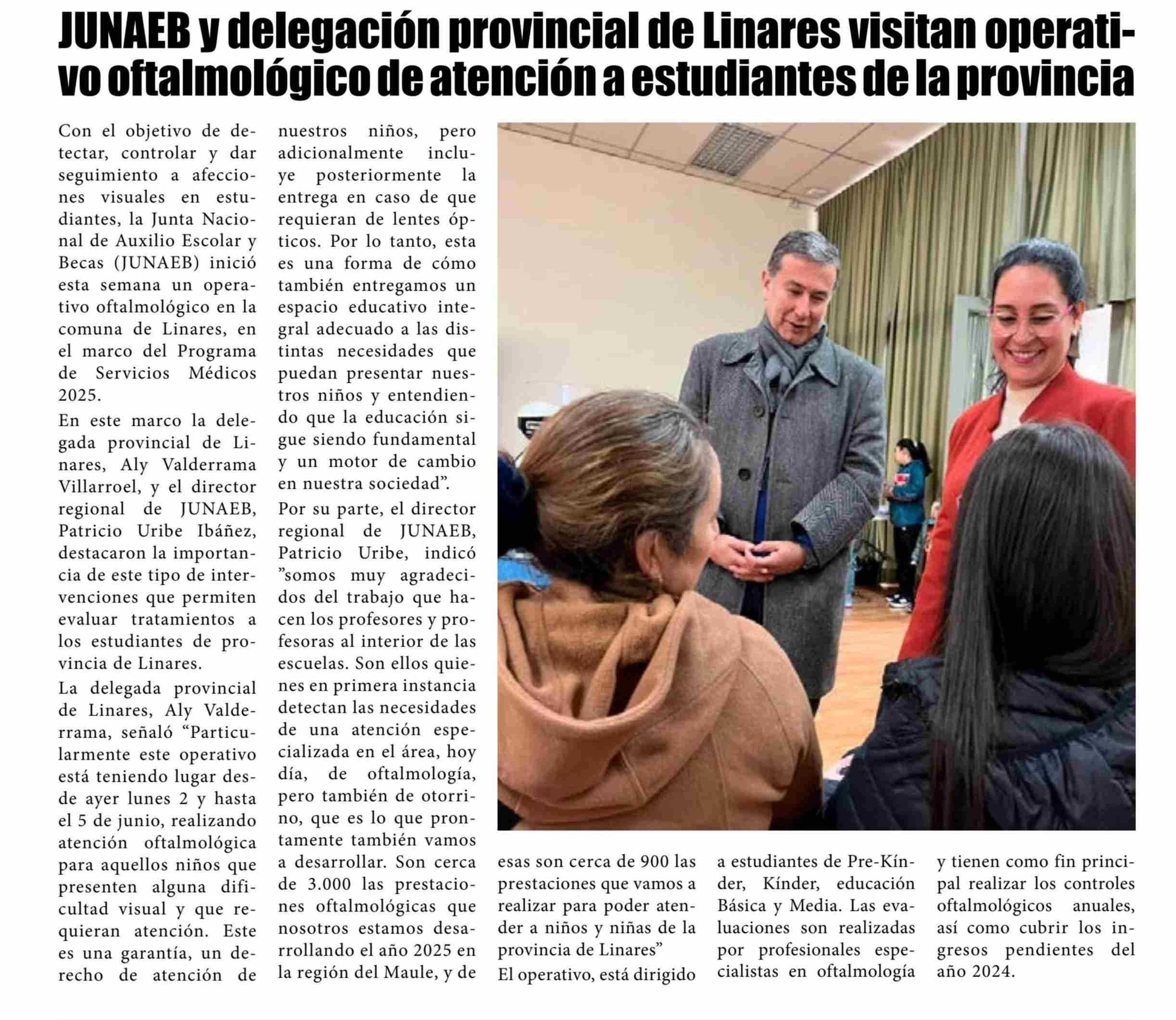 JUNAEB y delegación provincial de Linares visitan operativo oftalmológico de atención a estudiantes de la provincia 04-06-2025 El Lector |