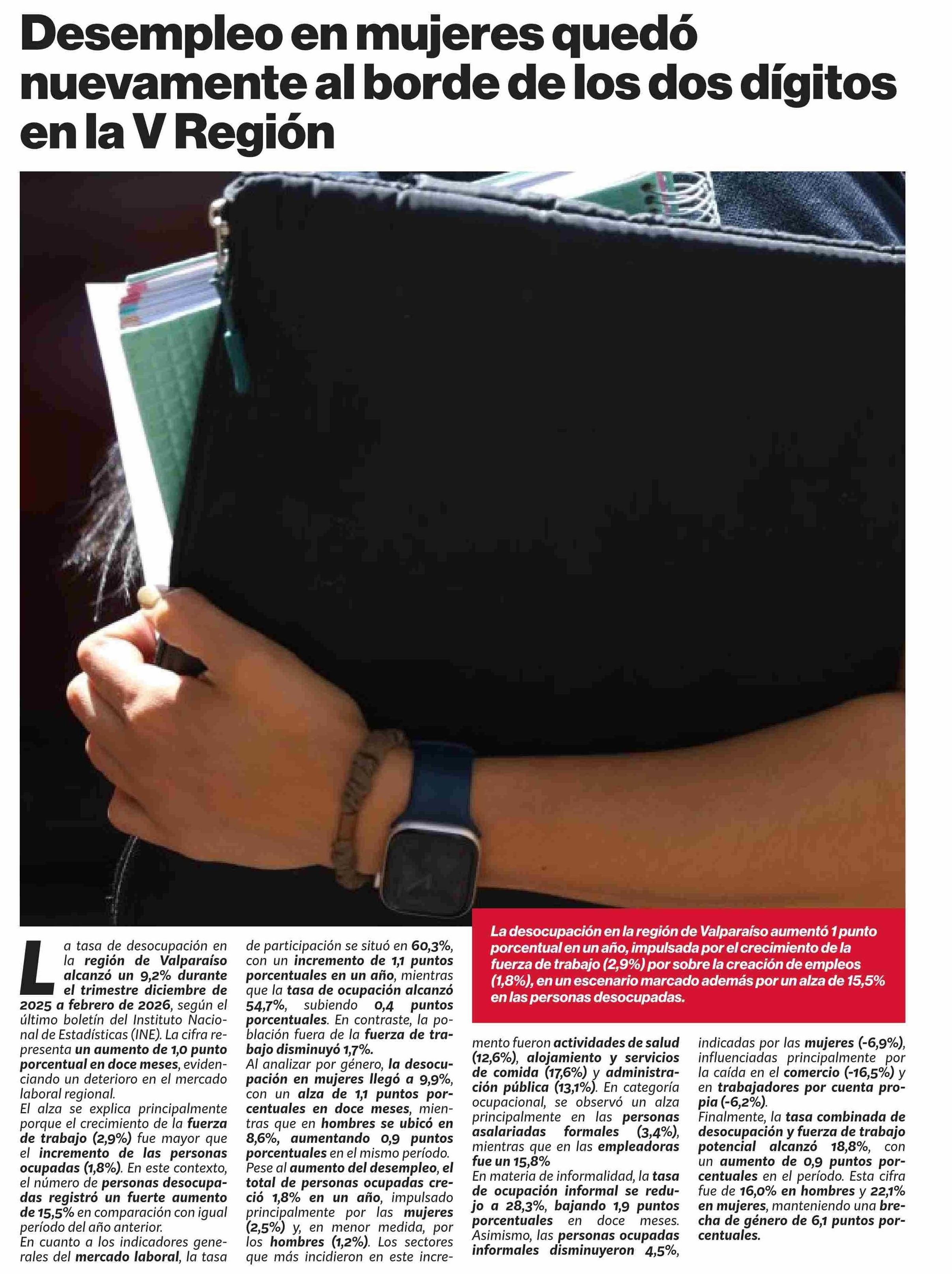 Desempleo en mujeres quedó nuevamente al borde de los dos dígitos en la V Región 30-03-2026 Puranoticia.cl |