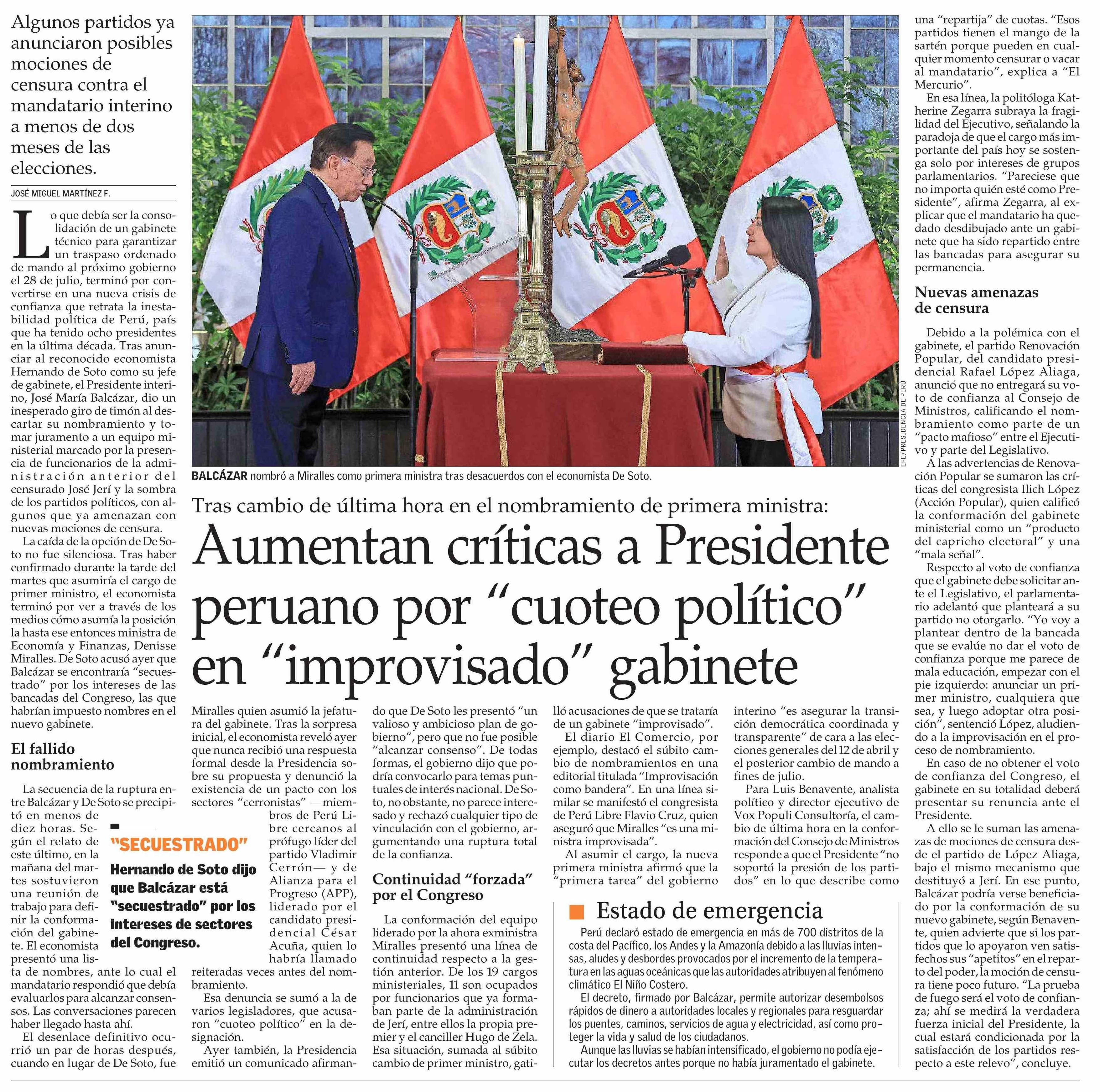 Aumentan críticas a Presidente peruano por “cuoteo político” en “improvisado” gabinete 26-02-2026 El Mercurio |