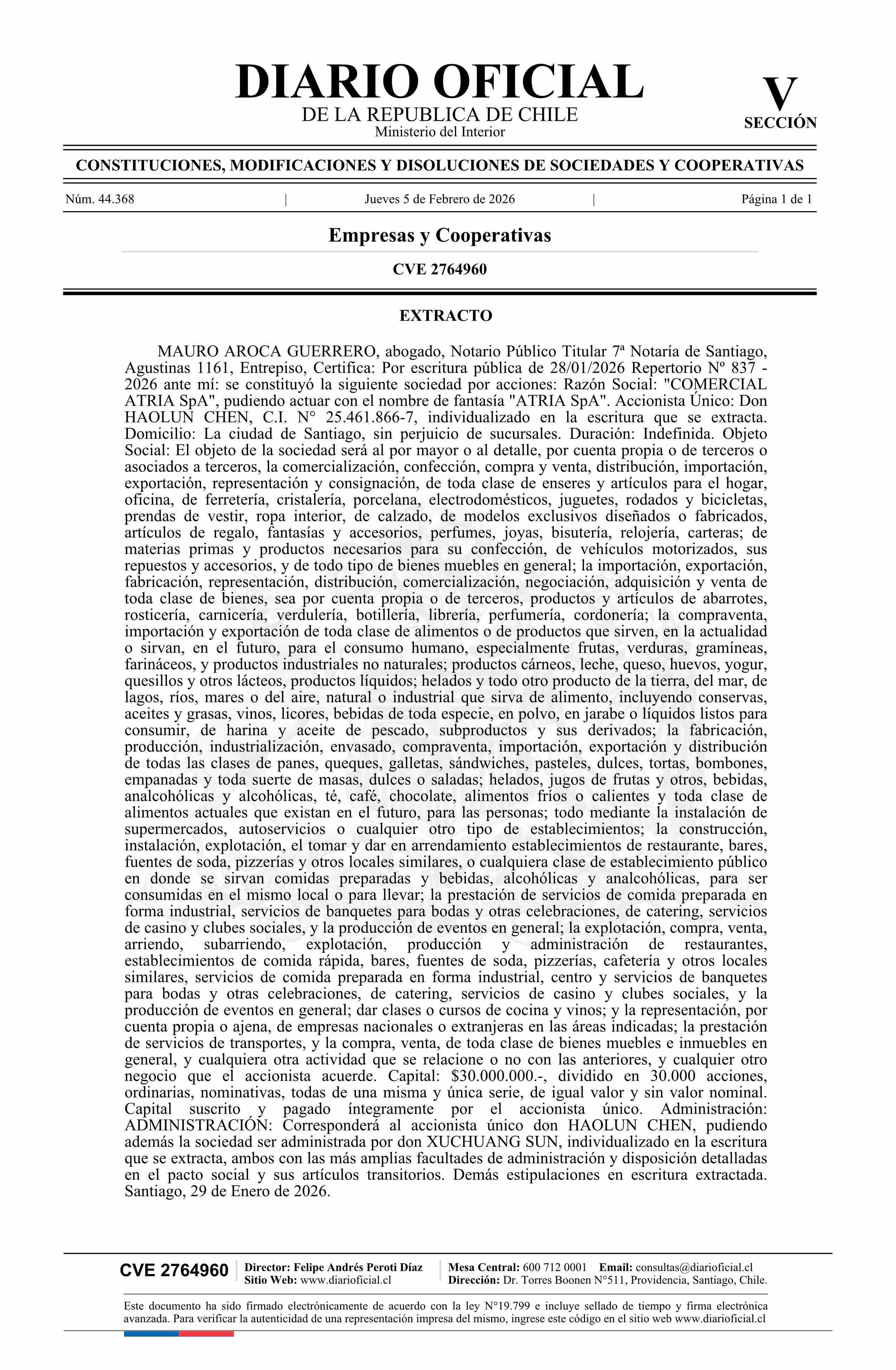 Comercial Atria SpA 05-02-2026 Diario Oficial Edición Electrónica |