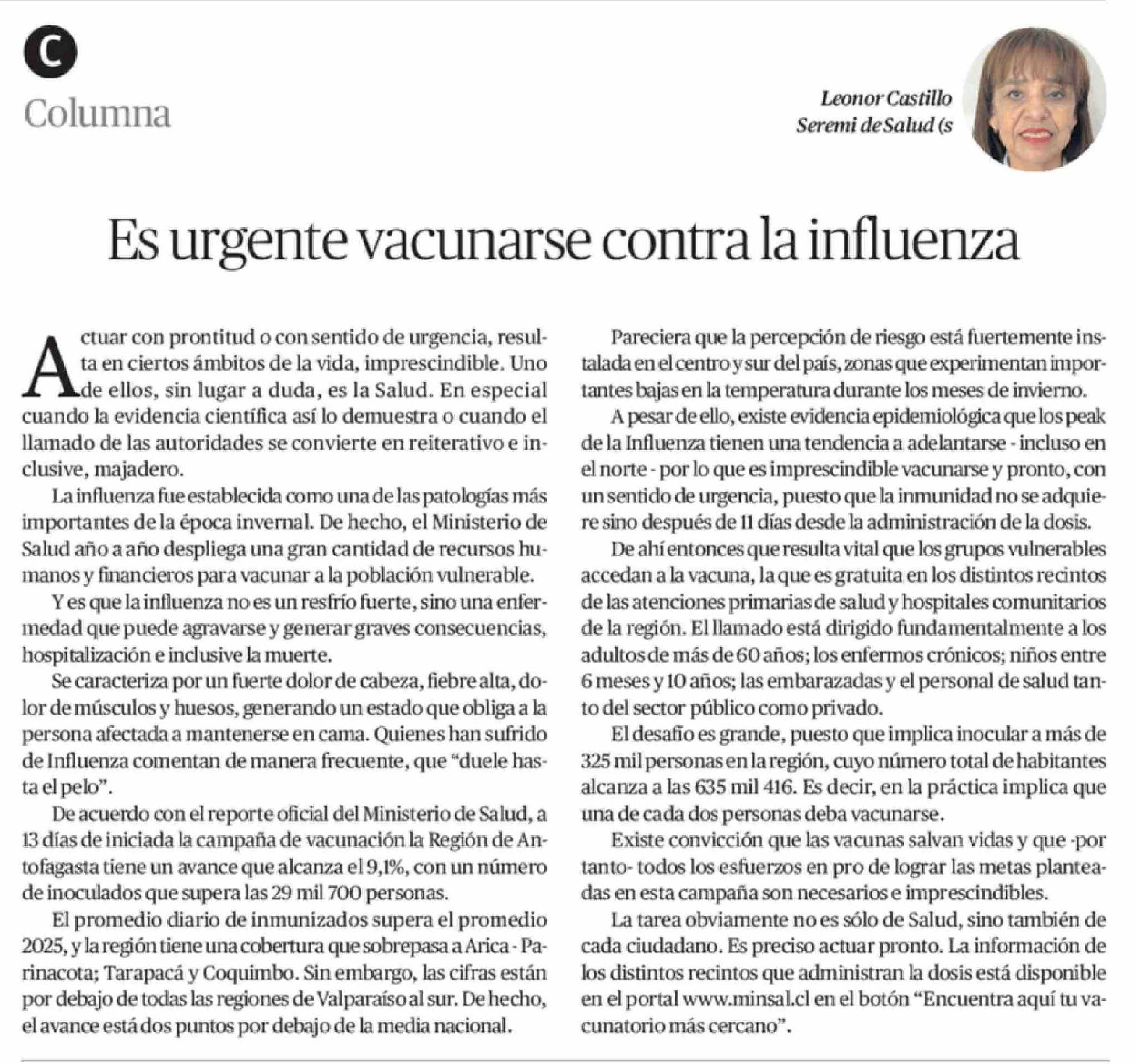 Título: Columnas de Opinión: Es urgente vacunarse contra la influenza
