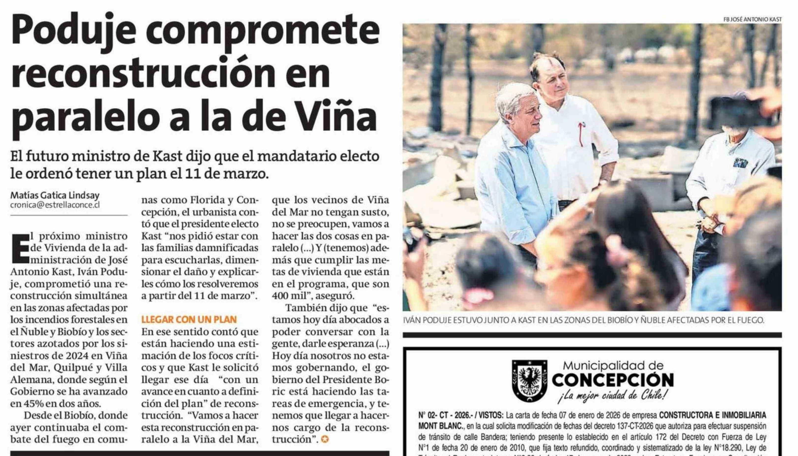 Poduje compromete reconstrucción en paralelo a la de Viña 23-01-2026 La Estrella de Concepción |