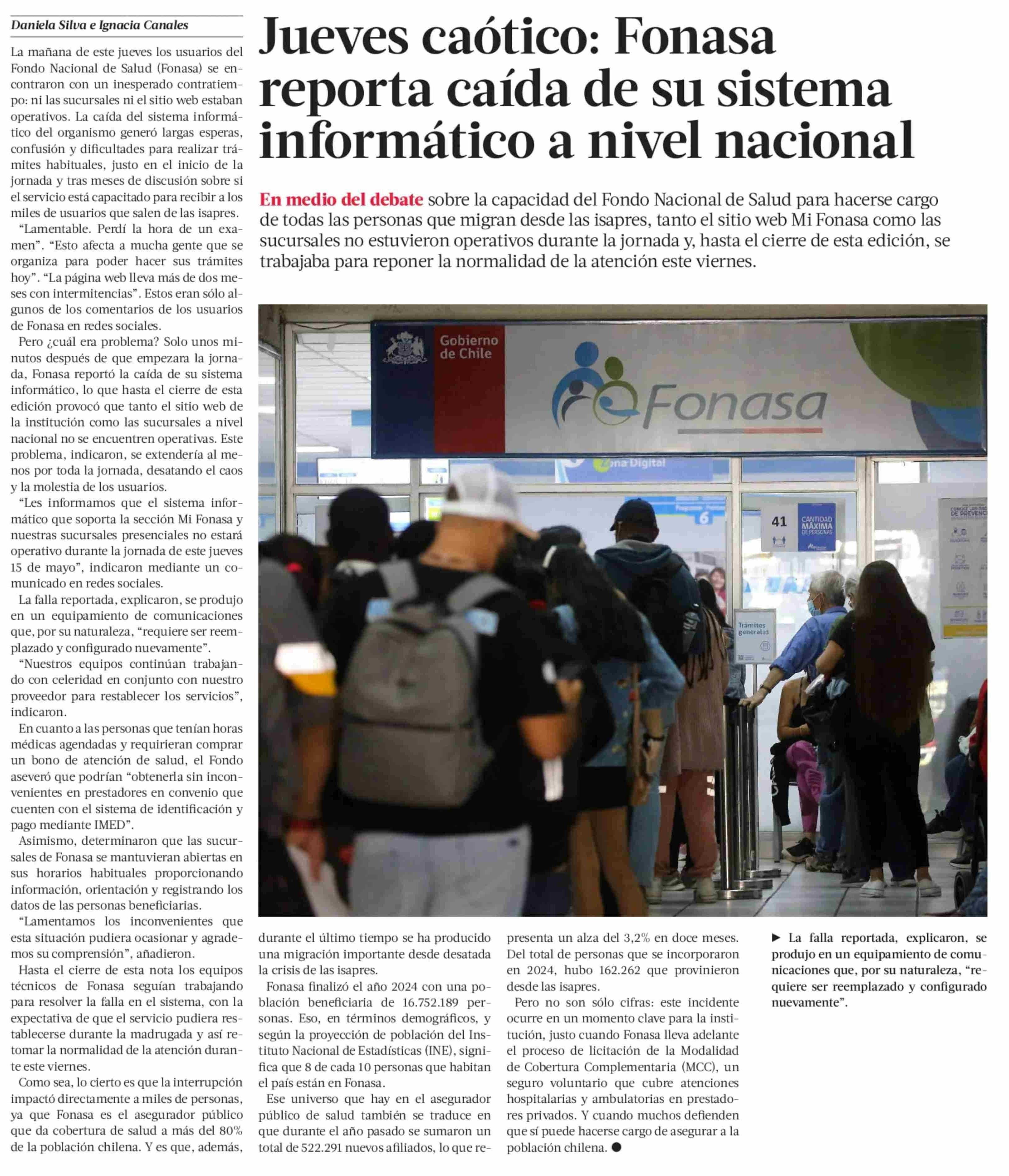 Jueves caótico: Fonasa reporta caída de su sistema informático a nivel nacional 16-05-2025 La Tercera |
