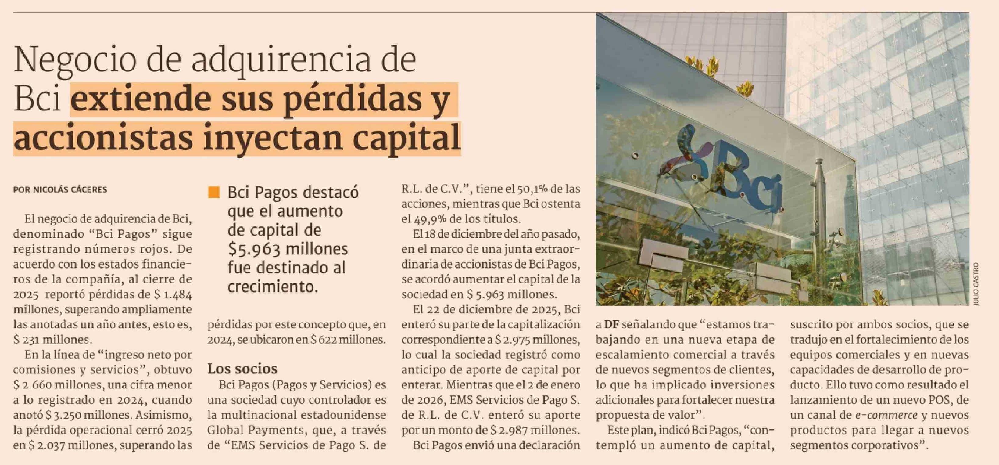 Negocio de adquirencia de Bci extiende sus pérdidas y accionistas inyectan capital 17-04-2026 Diario Financiero |