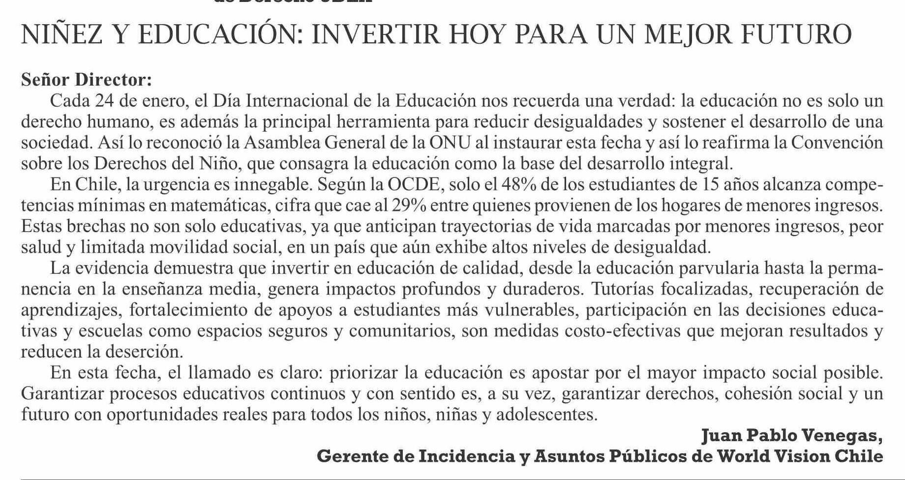 Cartas: NIÑEZ Y EDUCACIÓN: INVERTIR HOY PARA UN MEJOR FUTURO 27-01-2026 El Pingüino |