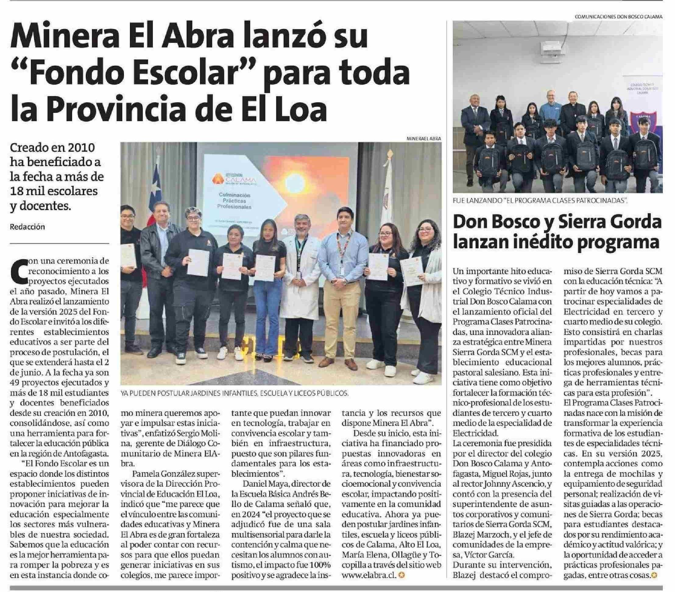 Minera El Abra lanzó su “Fondo Escolar” para toda la Provincia de El Loa 17-05-2025 La Estrella de Antofagasta |