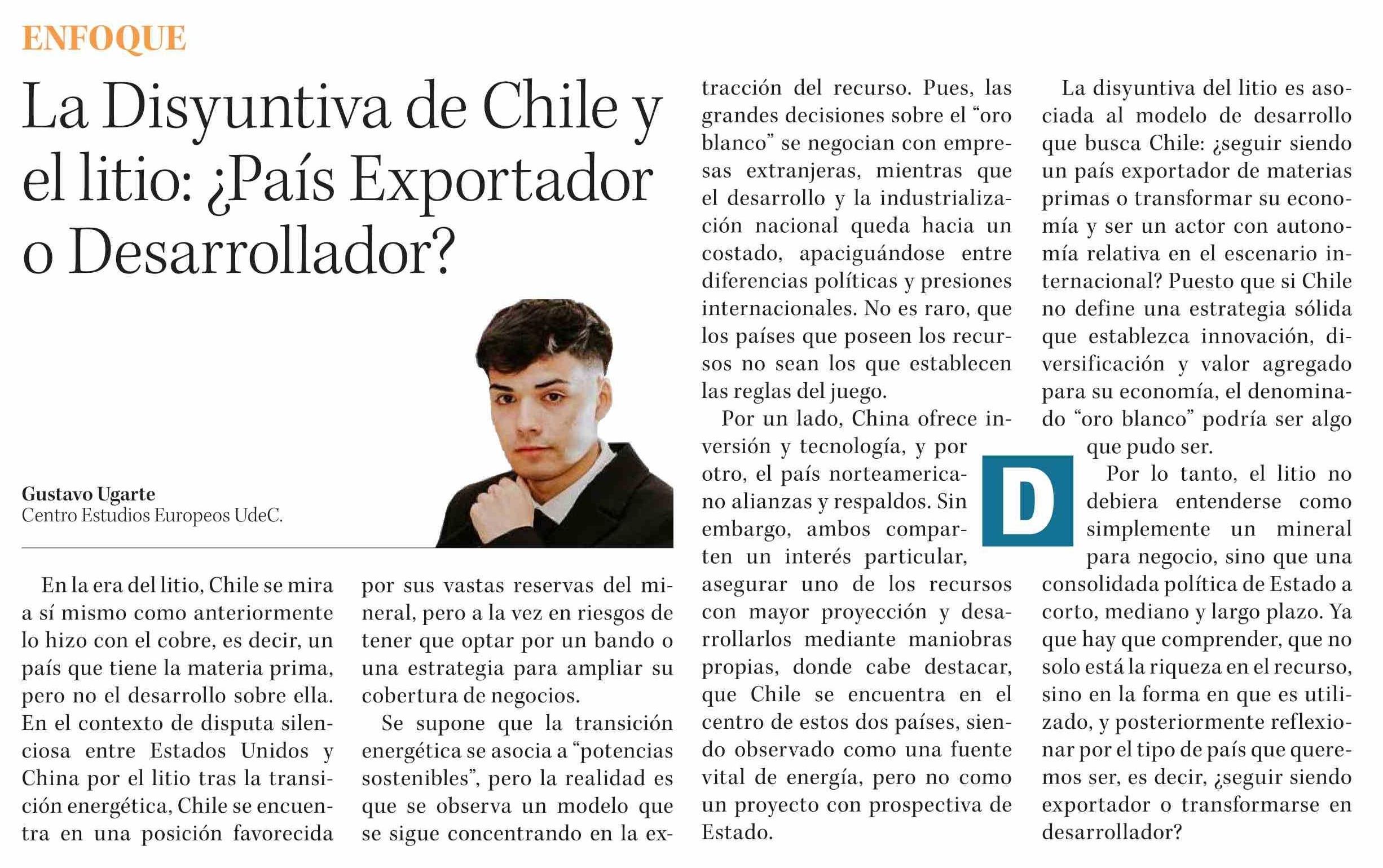 Columnas de Opinión: La Disyuntiva de Chile y el litio: ¿ País Exportador o Desarrollador? 24-01-2026 Diario Concepción |