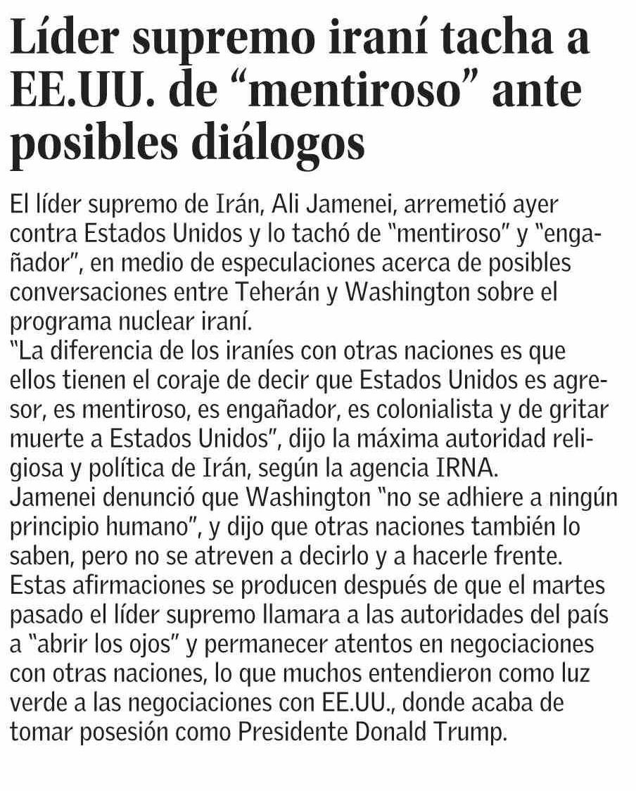 Líder supremo iraní tacha a EE.UU. de "mentiroso" ante posibles diálogos 03-02-2025 El Mercurio |