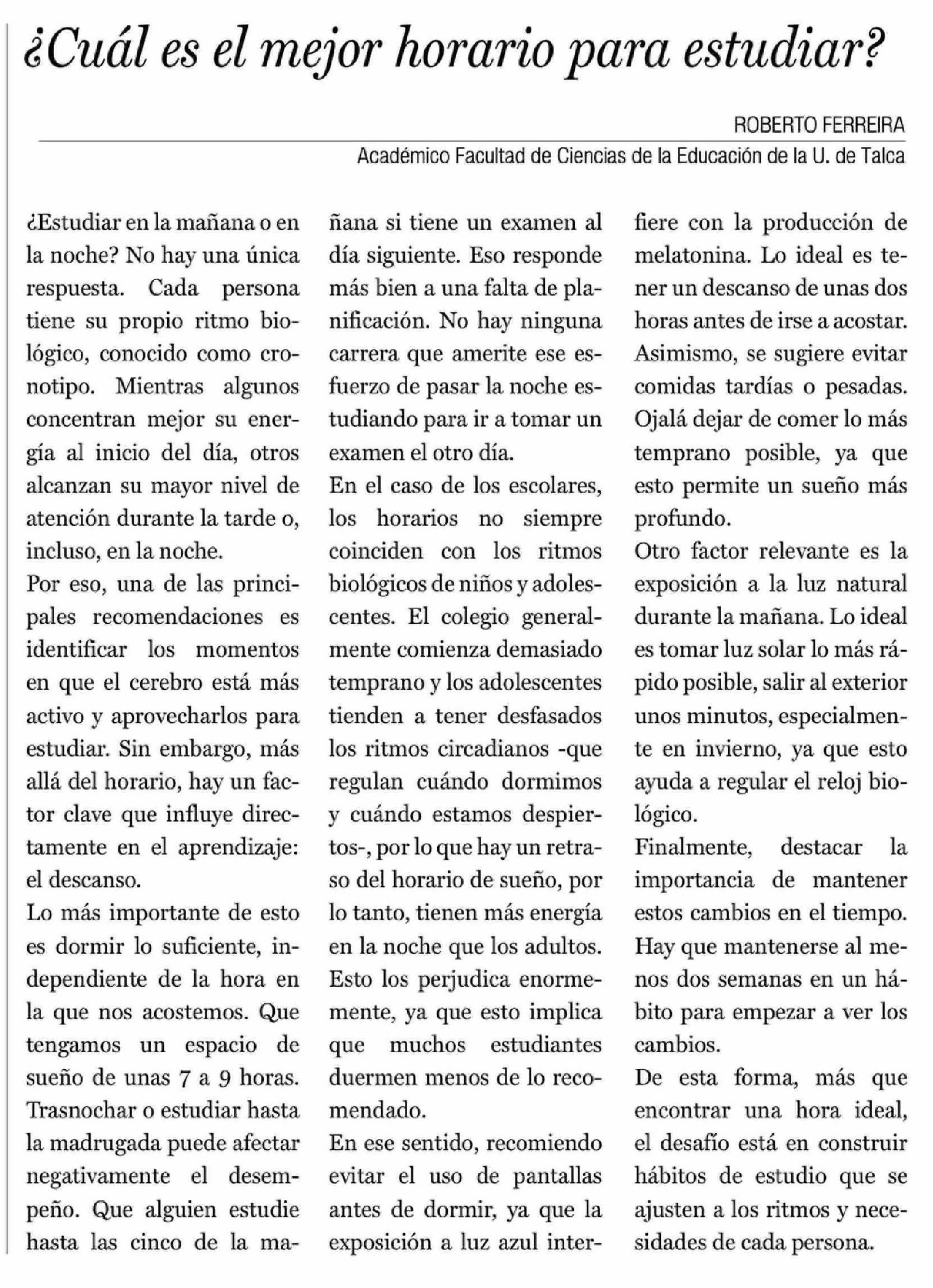 Cartas: ¿Cuál es el mejor horario para estudiar? 21-04-2026 La Prensa de Curicó |