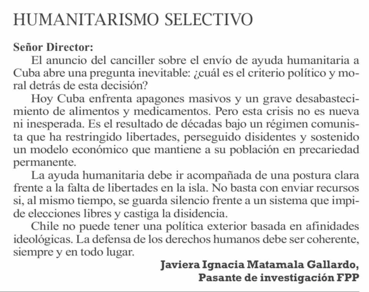 Título: Cartas: Señor Director: El anuncio del canciller sobre el envío de ayuda humanitaria a Cuba abre una pregunta inevitable: ¿ cuál es el criterio político y moral detrás de esta decisión? Hoy Cuba enfrenta apagones masivos y un grave desabastecimiento de alimentos y medicamentos. Pero esta crisis no e