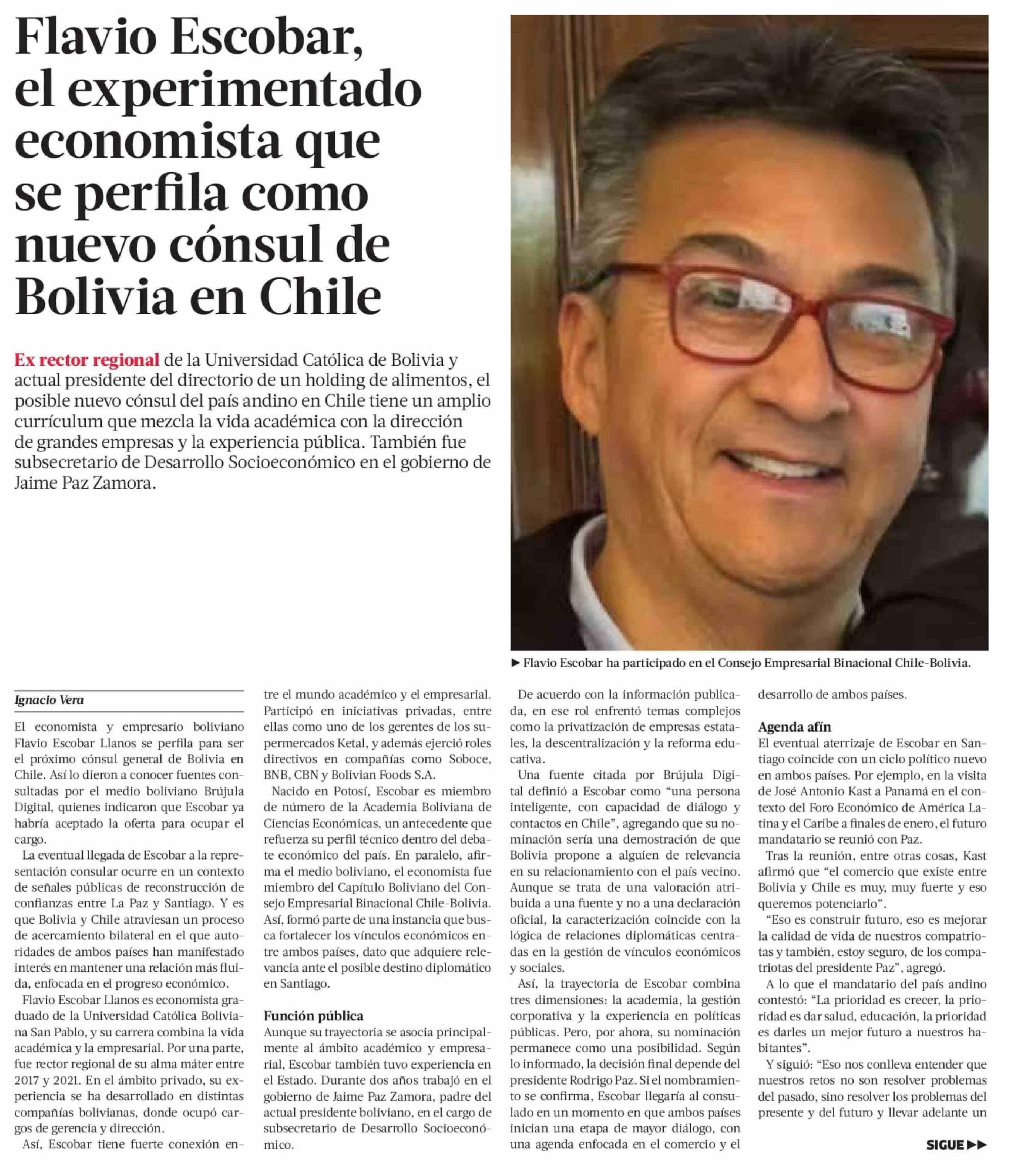 Título: Flavio Escobar, el experimentado economista que se perfila como nuevo cónsul de Bolivia en Chile