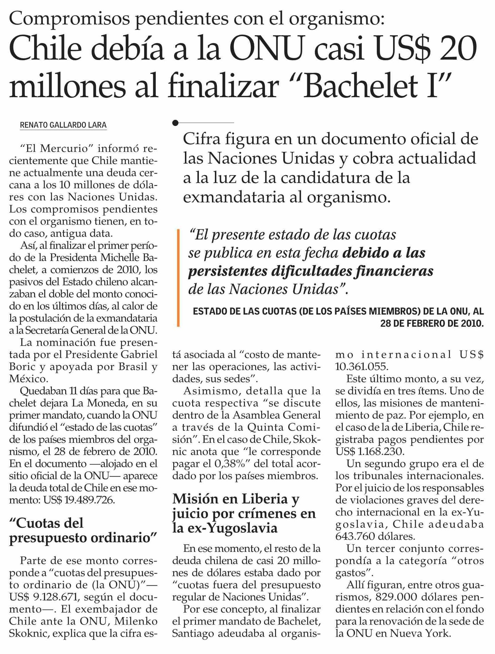 Título: Chile debía a la ONU casi US$ 20 millones al finalizar “Bachelet I”