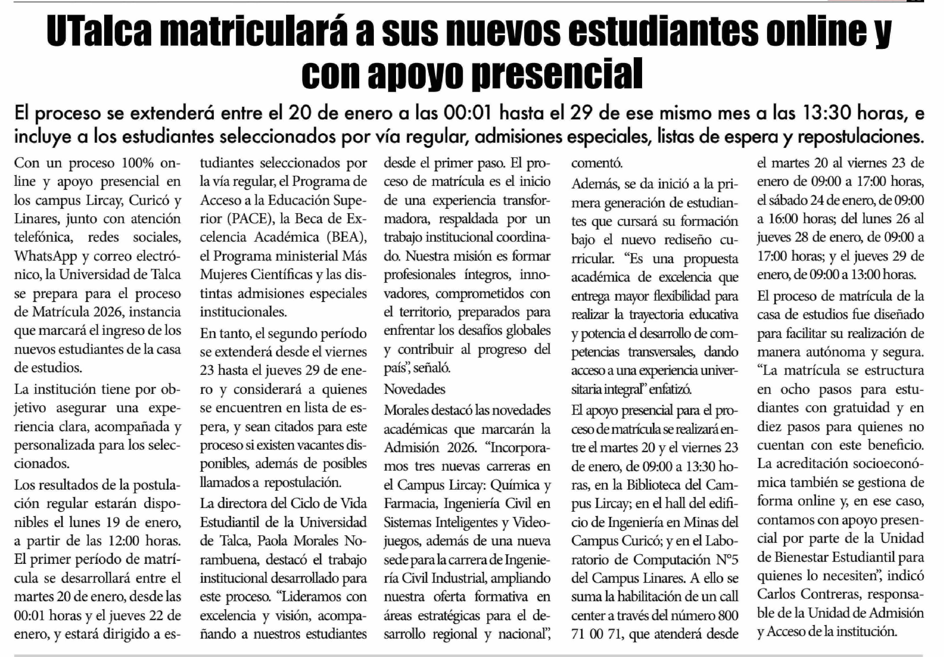 UTalca matriculará a sus nuevos estudiantes online y con apoyo presencial 16-01-2026 El Lector |