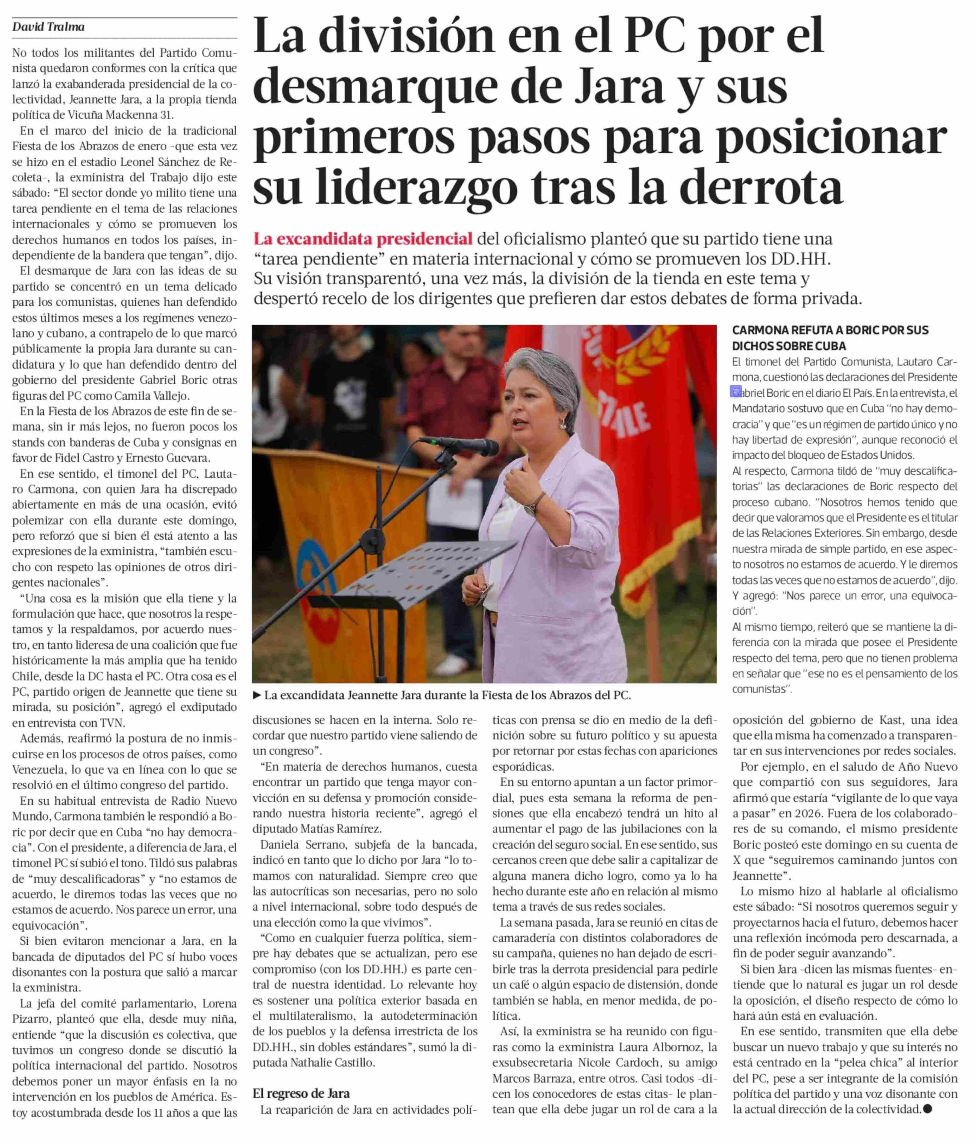 La división en el PC por el desmarque de Jara y sus primeros pasos para posicionar su liderazgo tras la derrota 12-01-2026 La Tercera |
