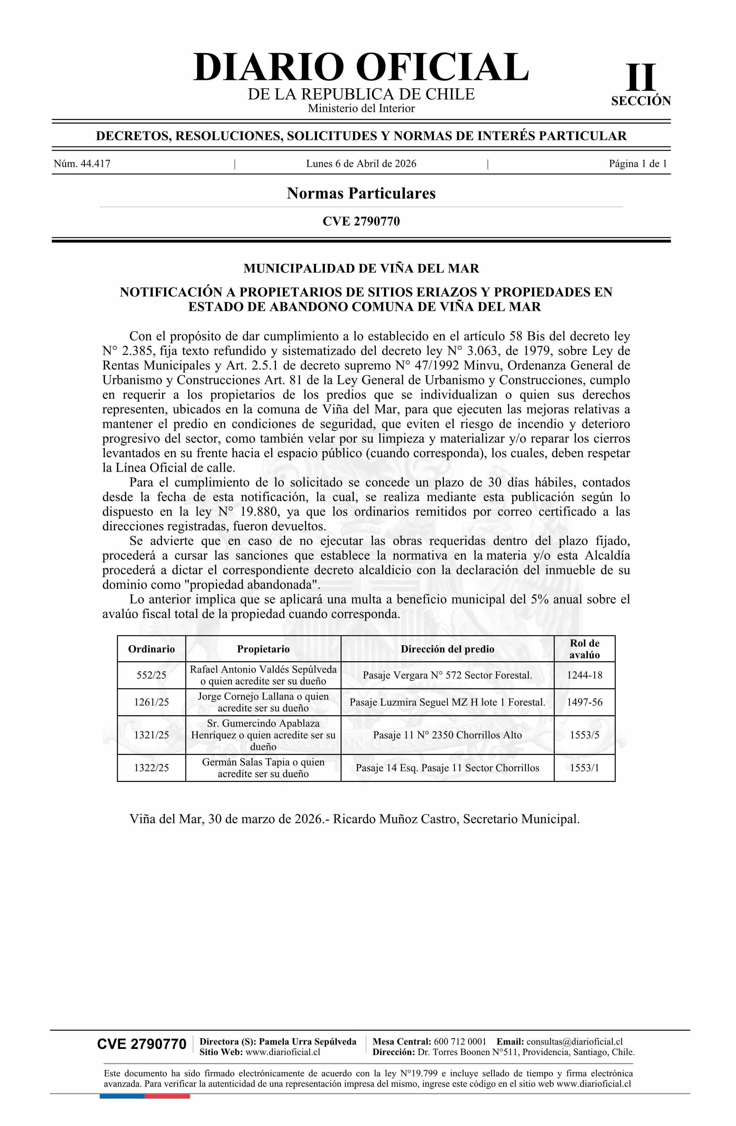 Notificación de Acto Administrativo Notificación a propietarios de sitios eriazos y propiedades en estado de abandono, comuna de Viña del Mar 06-04-2026 Diario Oficial Edición Electrónica |