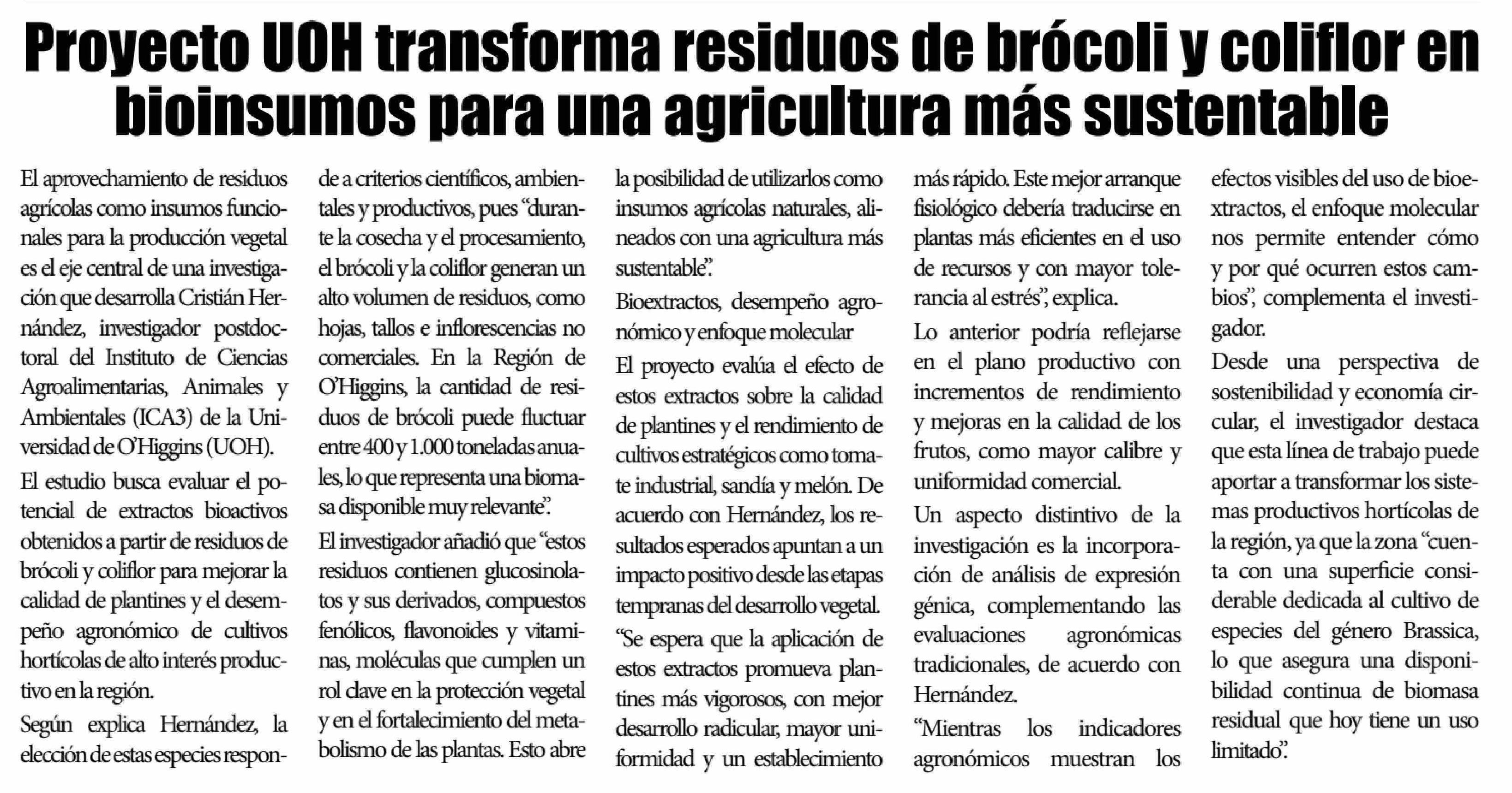 Proyecto UOH transforma residuos de brócoli y coliflor en bioinsumos para una agricultura más sustentable 22-01-2026 El Lector |