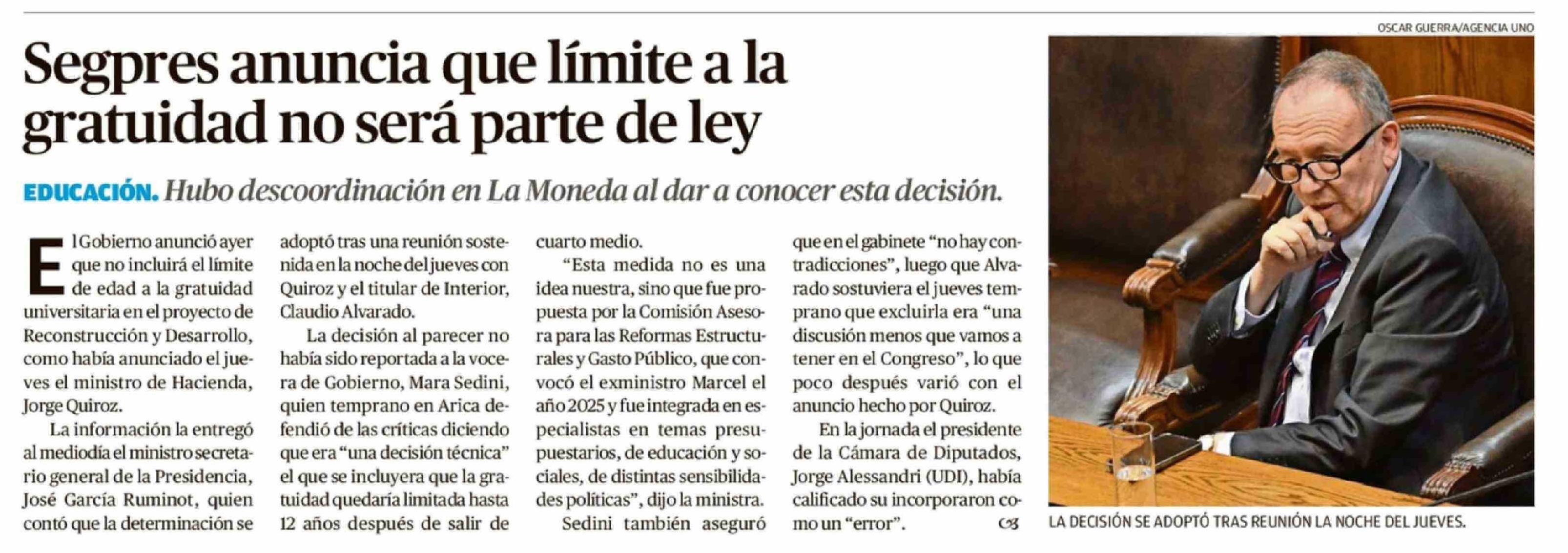 Segpres anuncia que límite a la gratuidad no será parte de ley 18-04-2026 El Llanquihue |