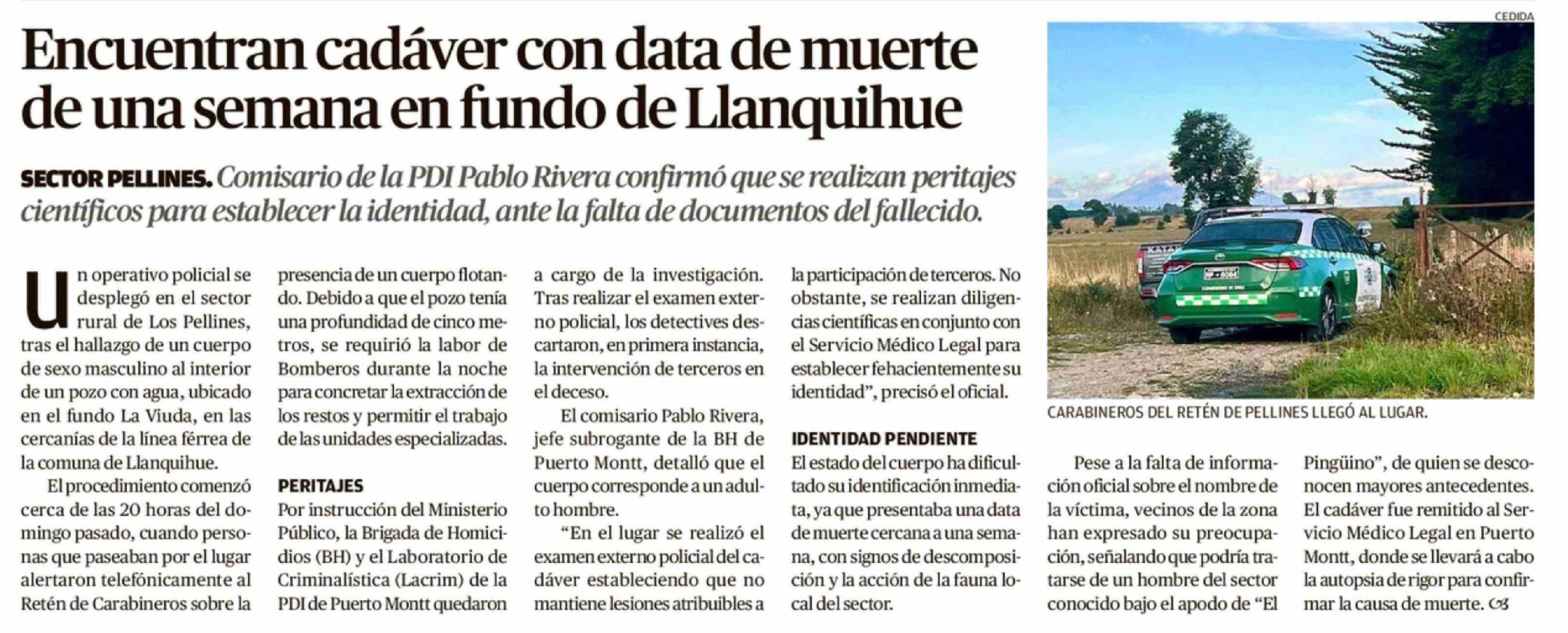 | Título: | Encuentran cadáver con data de muerte de una semana en fundo de Llanquihue |