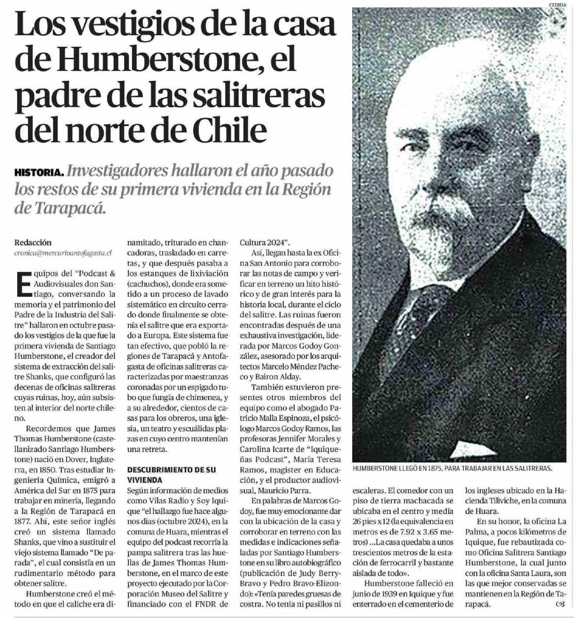 Los vestigios de la casa de Humberstone, el padre de las salitreras del norte de Chile 12-01-2025 El Mercurio de Calama |