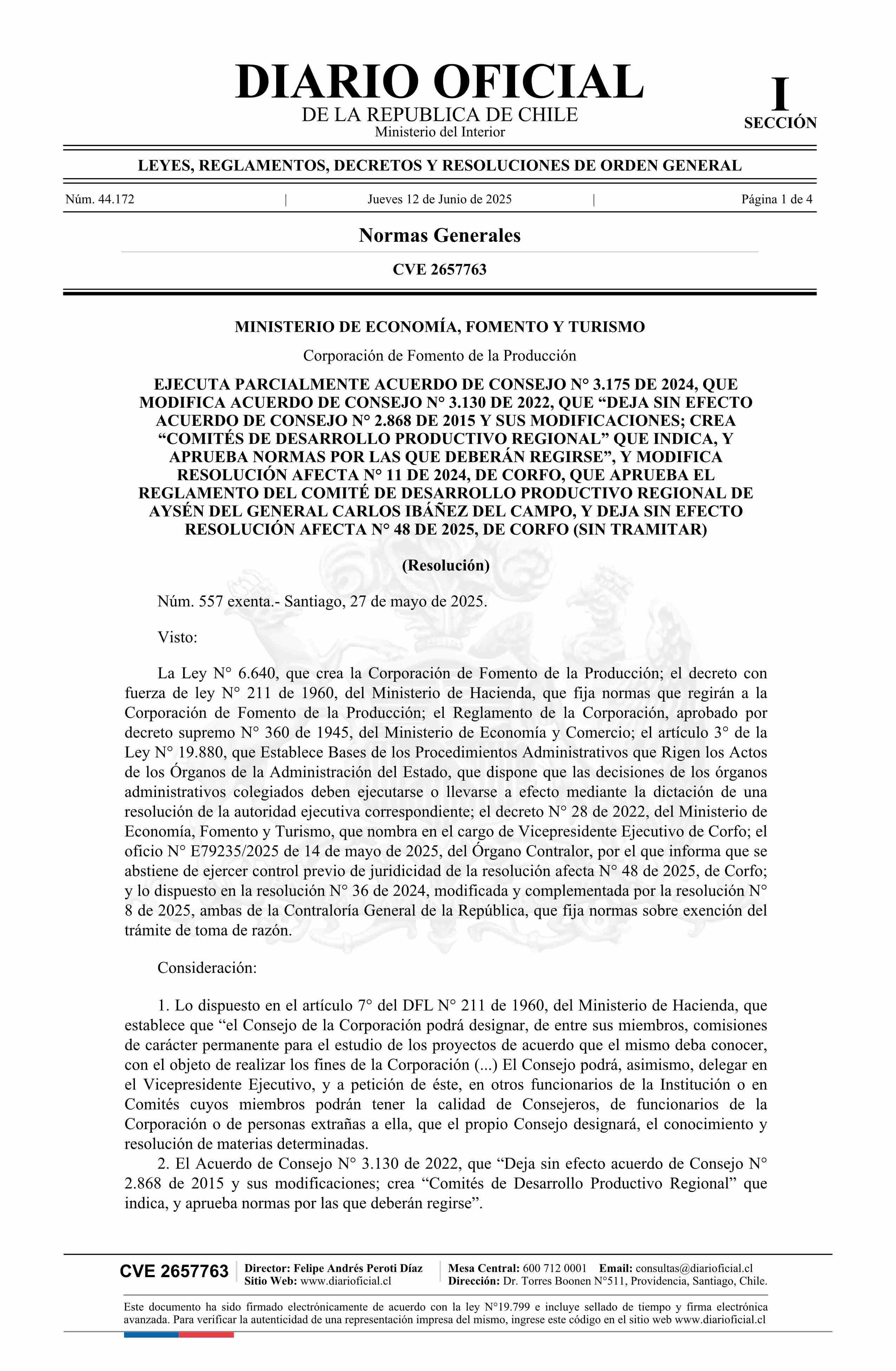 | Título: | Resolución exenta número 557, de 2025.- Ejecuta parcialmente Acuerdo de Consejo N° 3.175 de 2024, que modifica Acuerdo de Consejo N° 3.130 de 2022, que deja sin efecto Acuerdo de Consejo N° 2.868 de 2015 y sus modificaciones; crea Comités de Desarrollo Productivo Regional que indica, y aprueba norma |