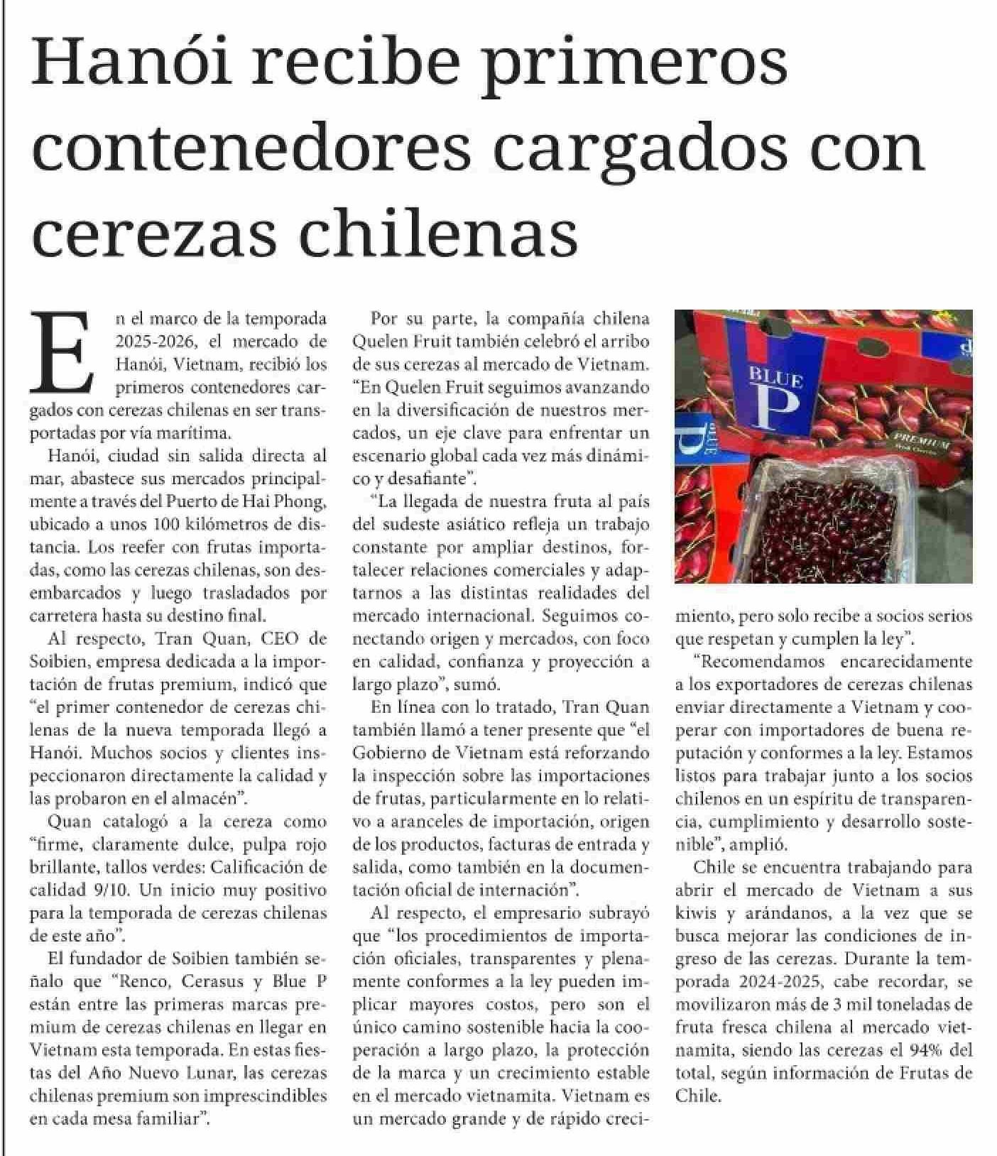 Hanói recibe primeros contenedores cargados con cerezas chilenas 05-01-2026 Diario Chañarcillo |