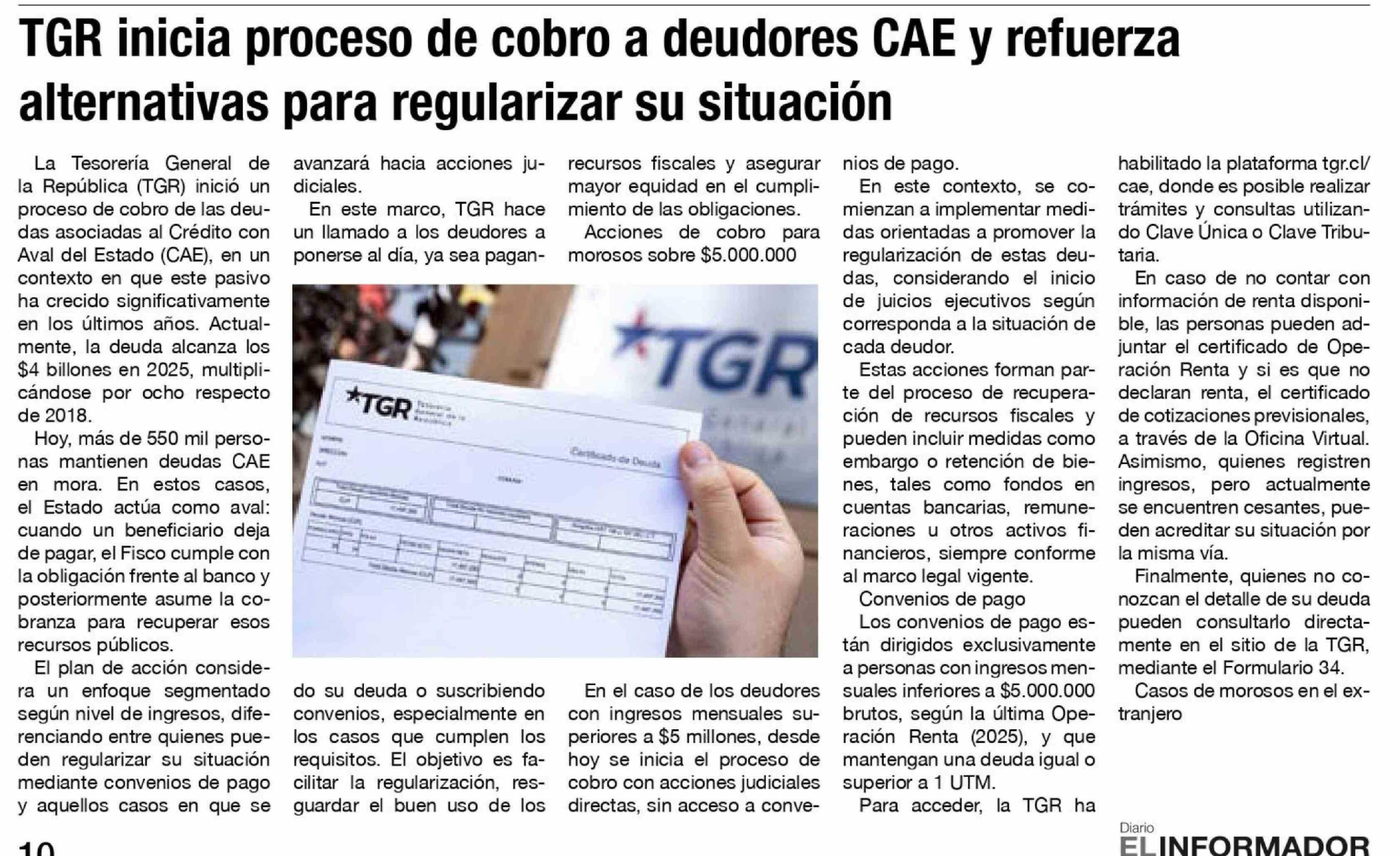 TGR inicia proceso de cobro a deudores CAE y refuerza alternativas para regularizar su situación 07-04-2026 El Informador |