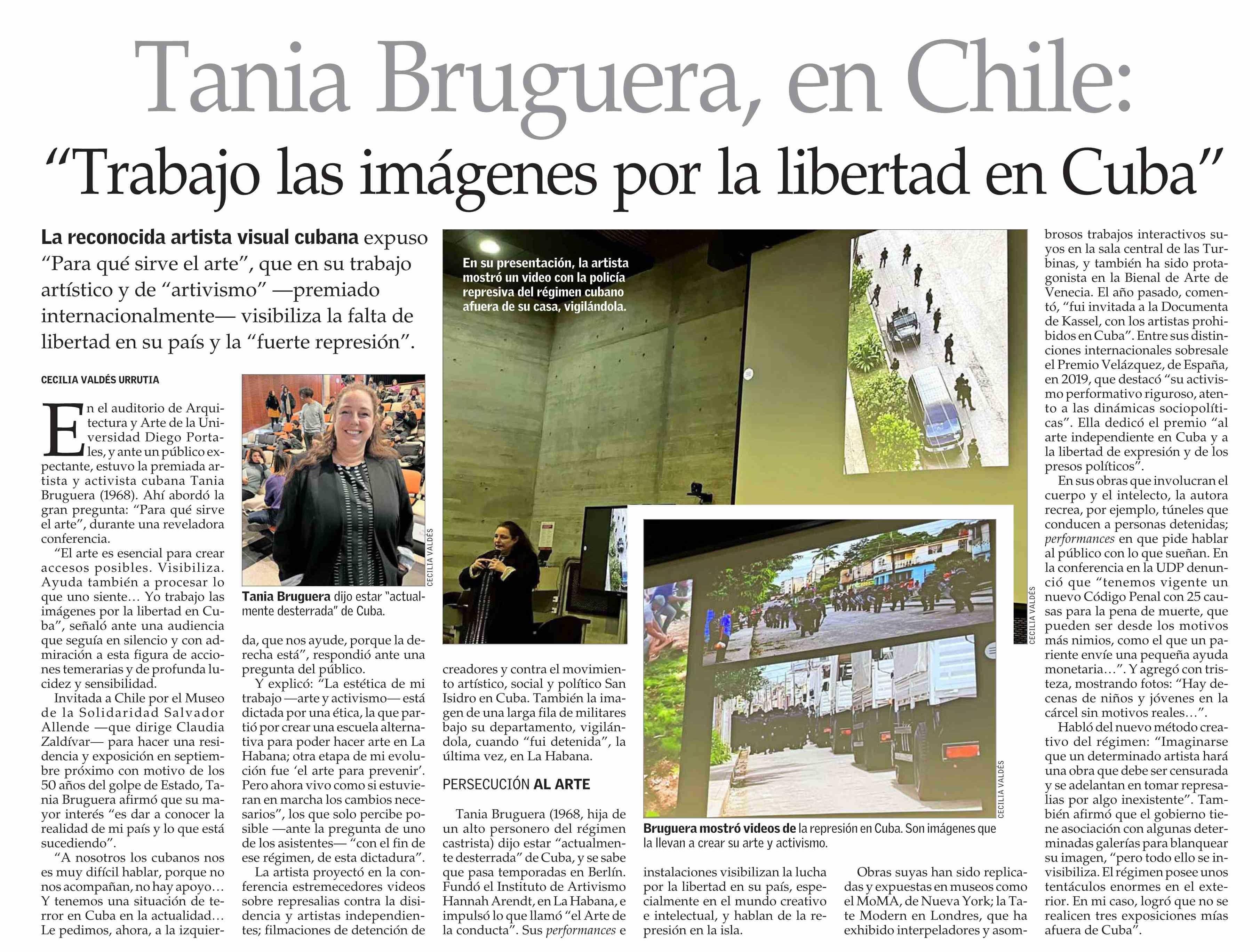 Tania Bruguera, en Chile: “Trabajo las imágenes por la libertad en Cuba” 23-06-2023 El Mercurio |