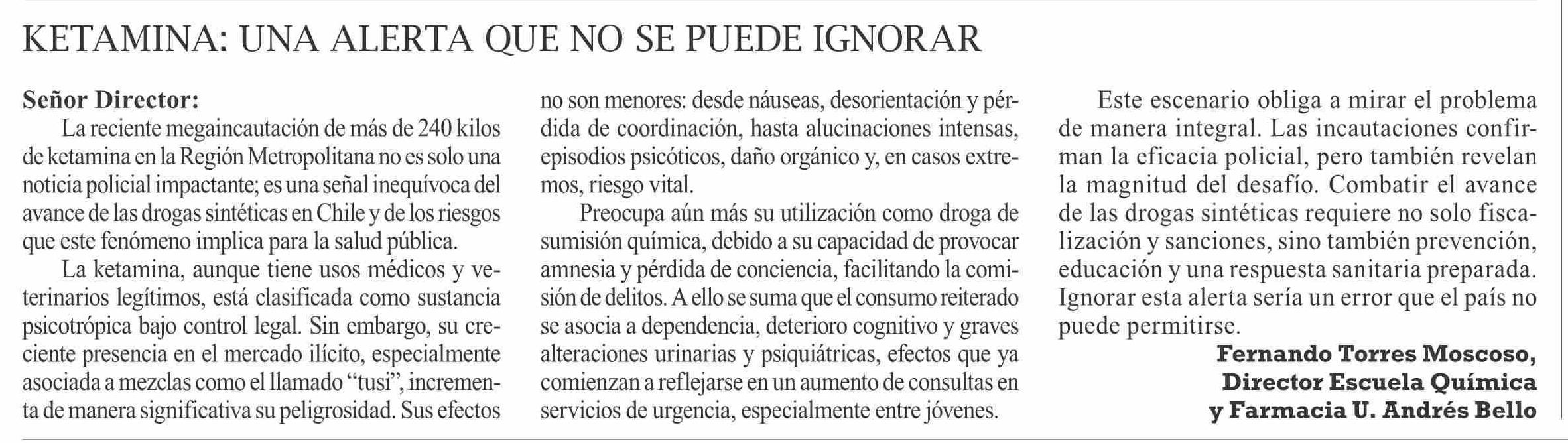 Cartas: KetaMina: una alerta que no se puede ignorar 13-04-2026 El Pingüino |