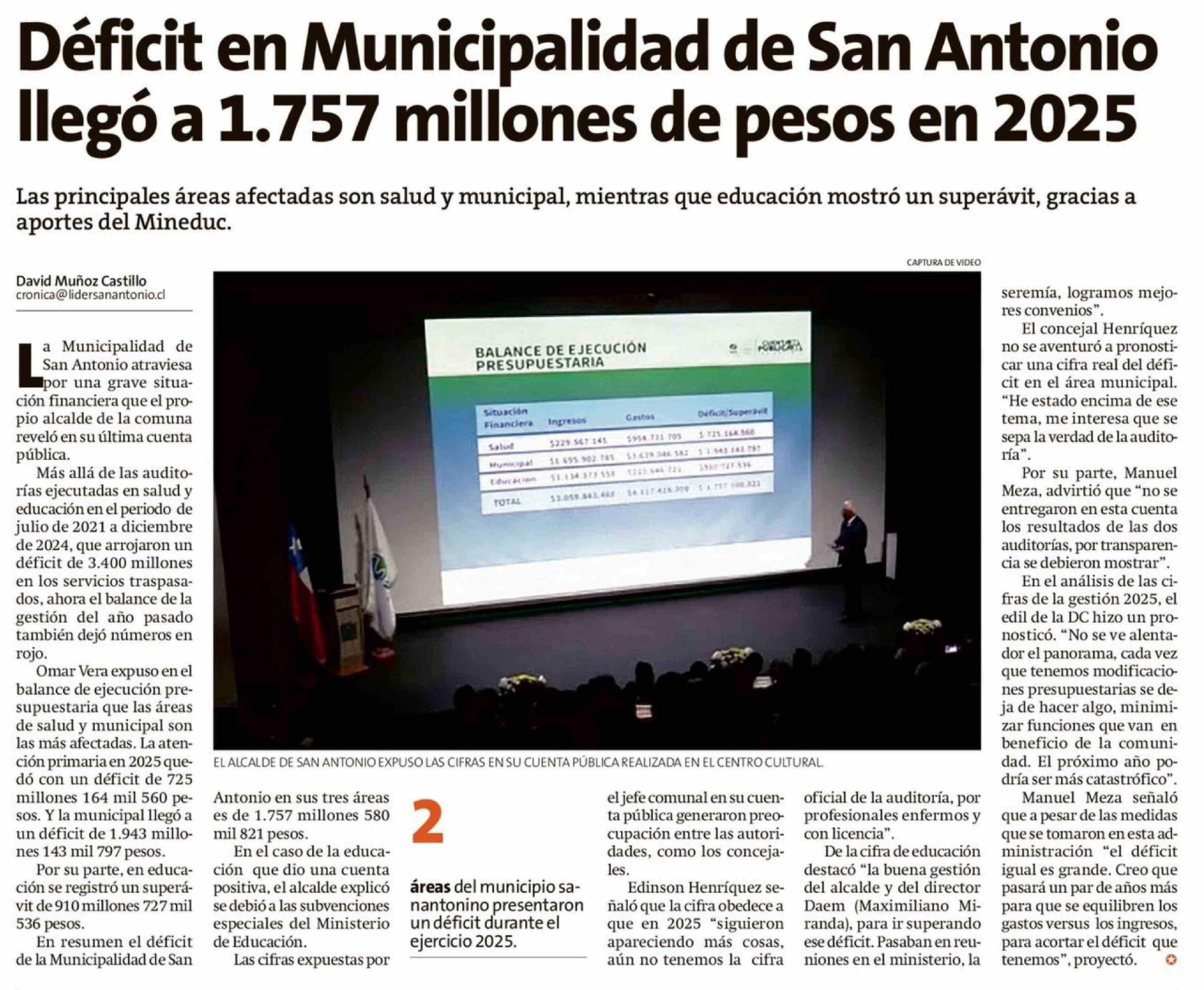 | Título: | Déficit en Municipalidad de San Antonio llegó a 1.757 millones de pesos en 2025 |
