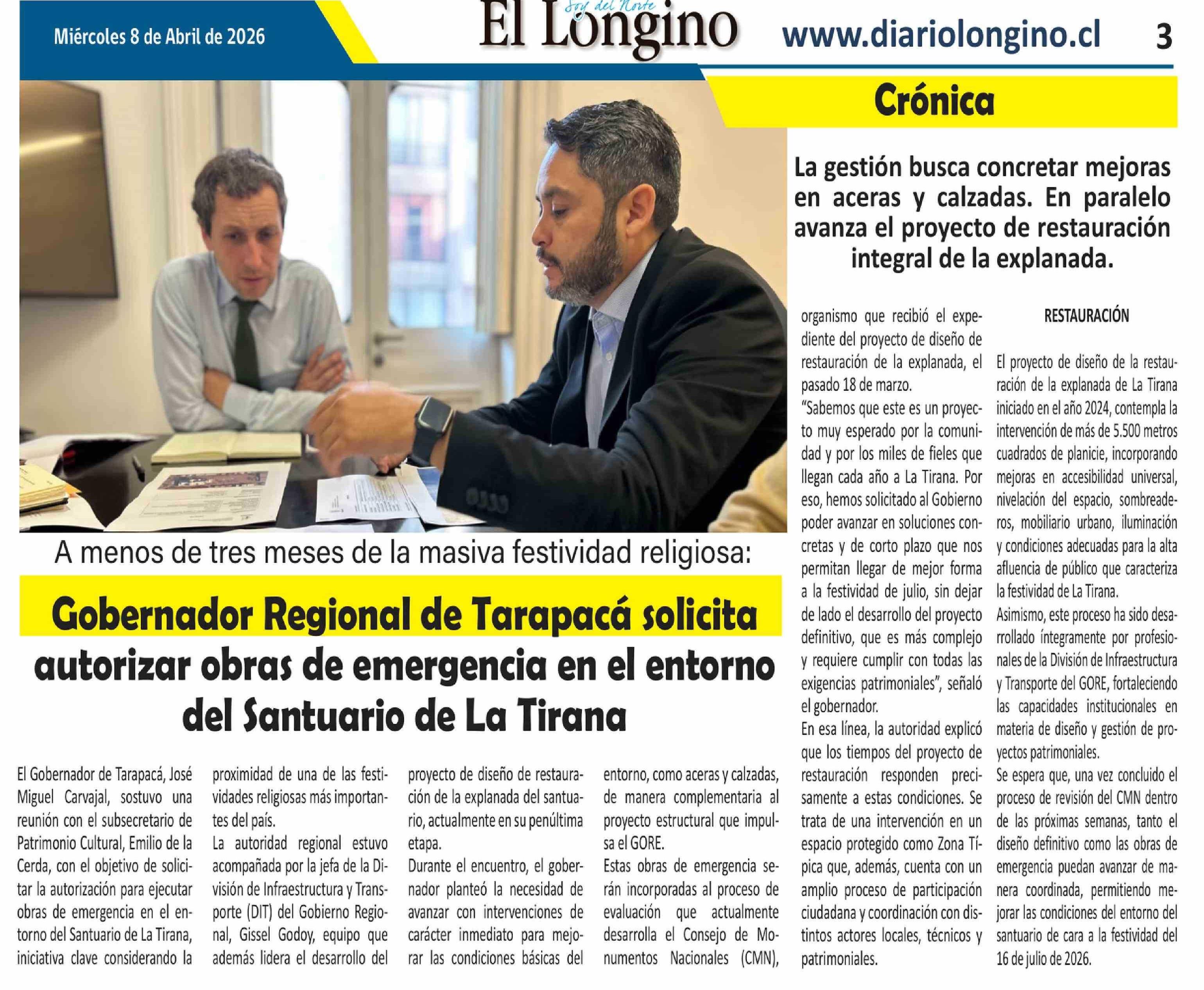 Título: Gobernador Regional de Tarapacá solicita autorizar obras de emergencia en el entorno del Santuario de La Tirana