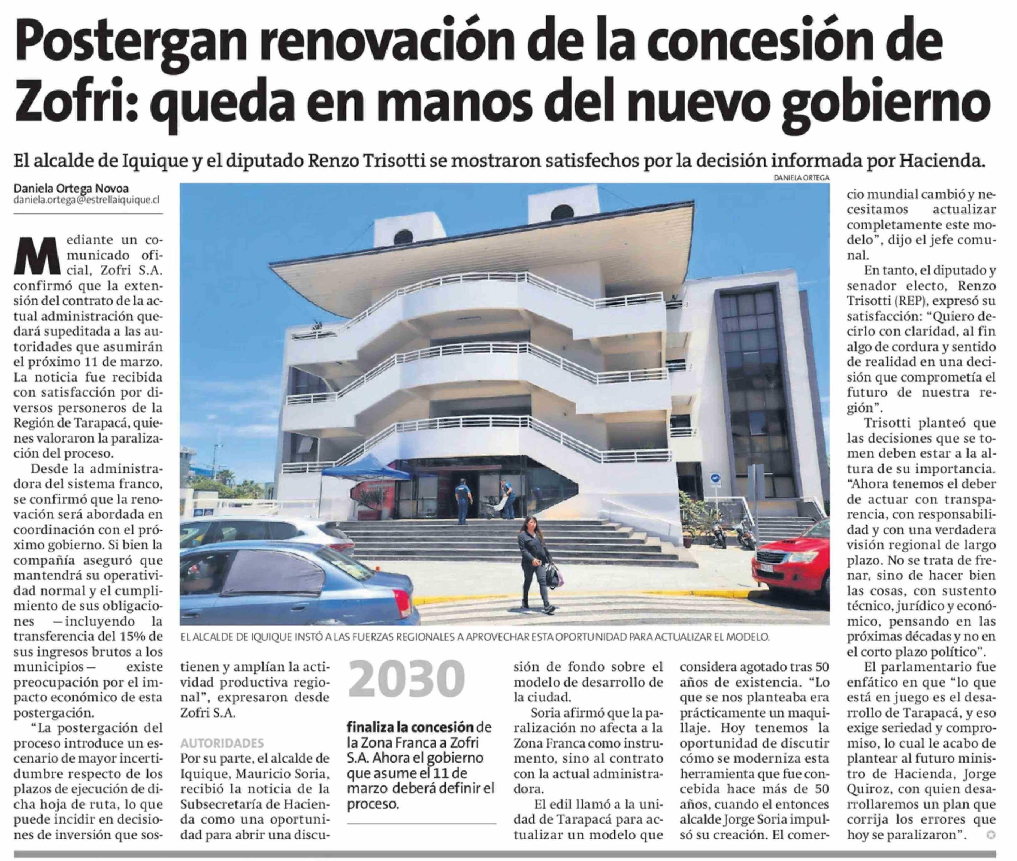 Postergan renovación de la concesión de Zofri: queda en manos del nuevo gobierno 04-03-2026 La Estrella de Iquique |